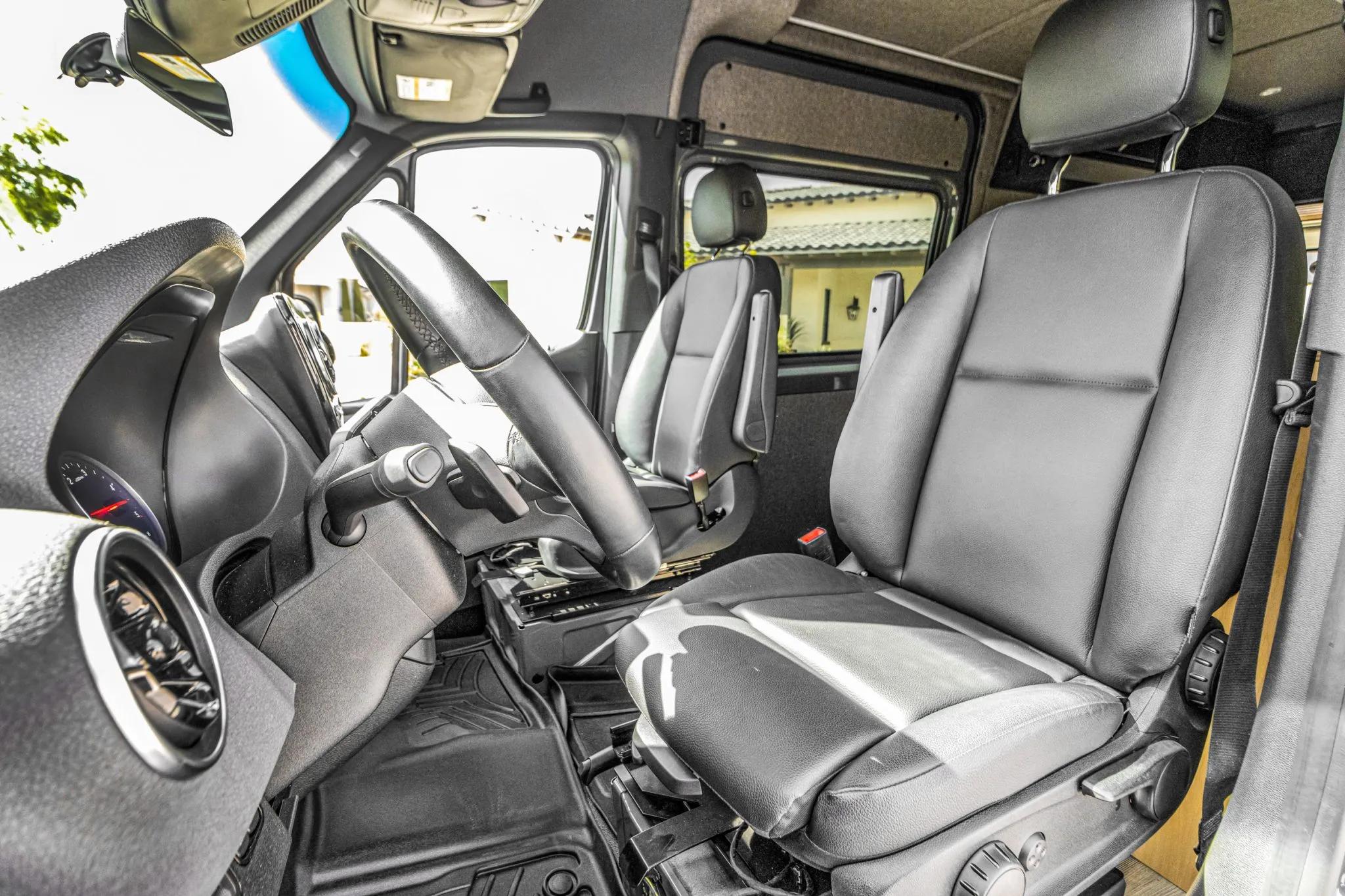 Finished in Pebble Grey over black leatherette, this high-roof Sprinter 2500 is powered by a 2.1-liter turbodiesel I4 producing 166 horsepower and 266 lb-ft of torque, paired with a seven-speed automatic transmission and rear-wheel drive.