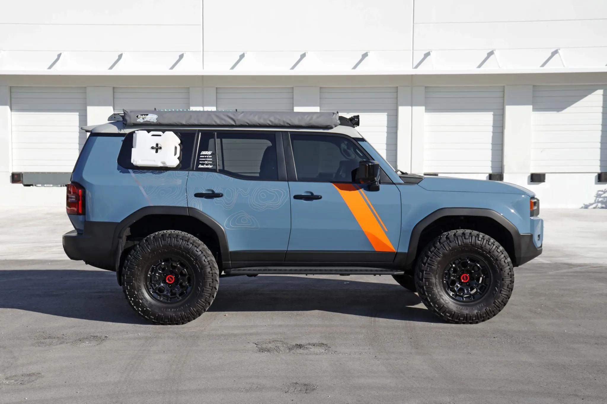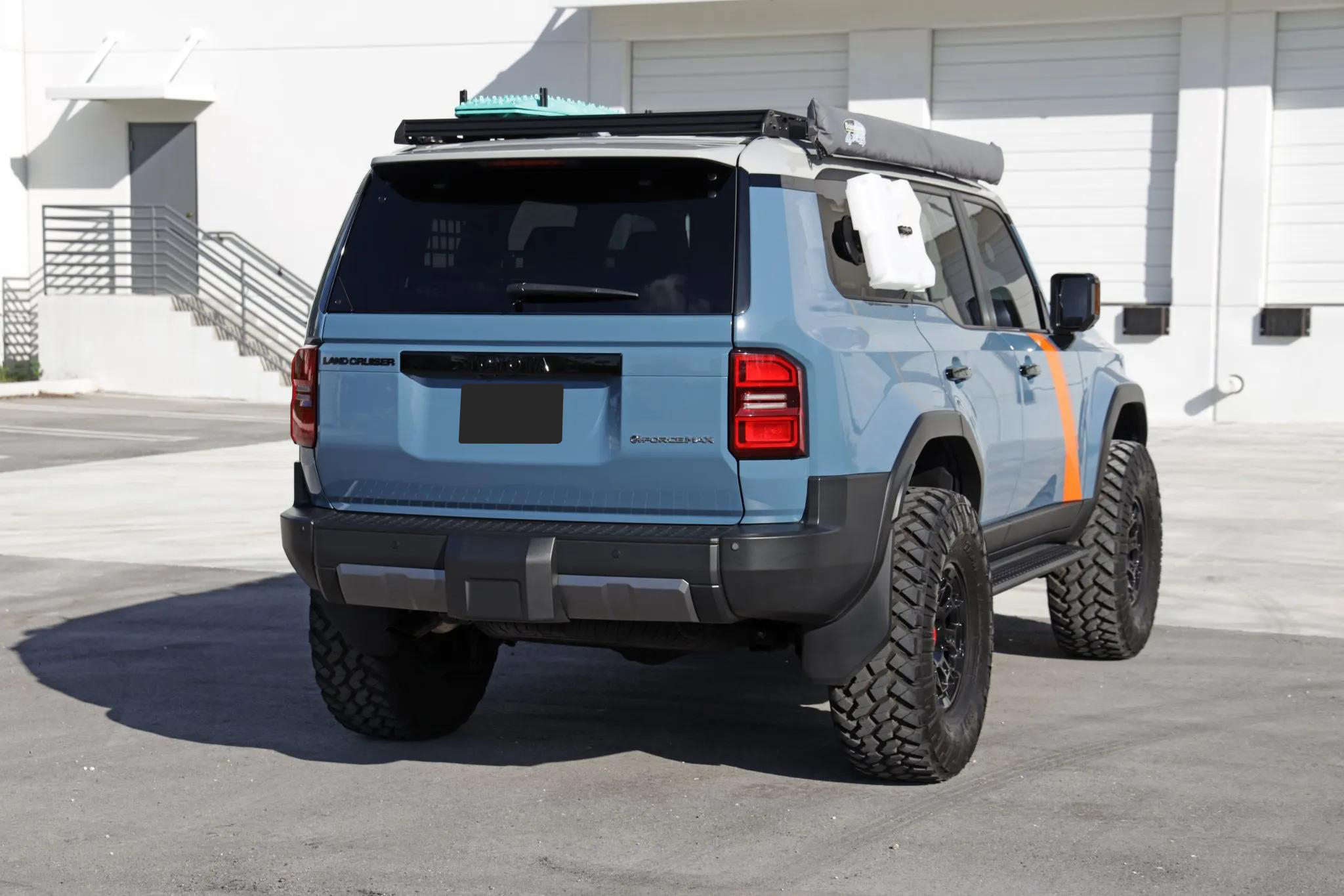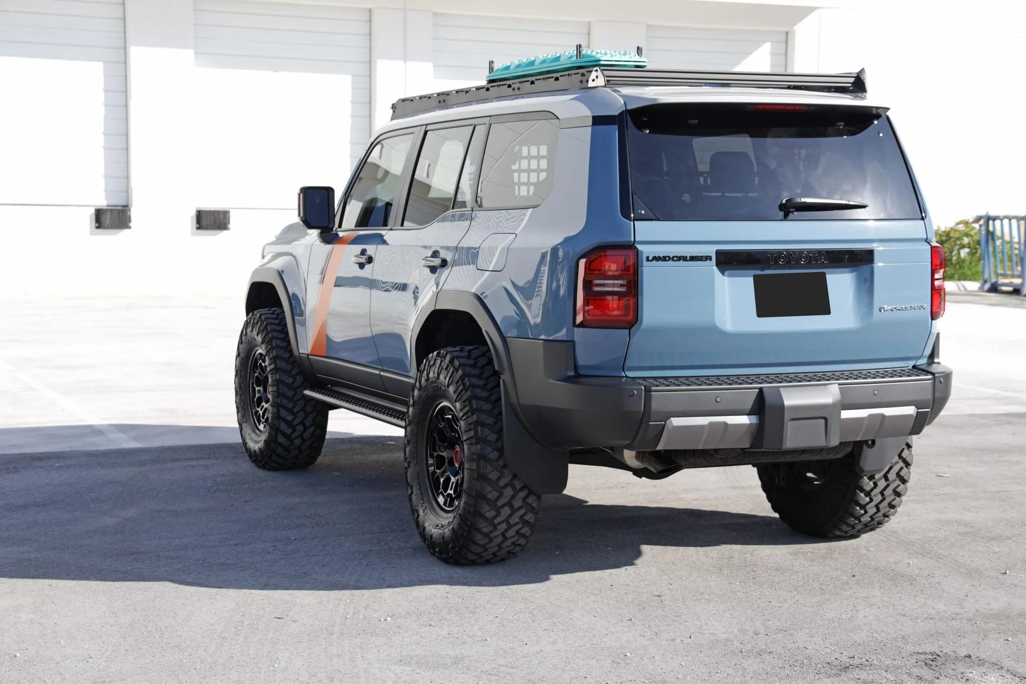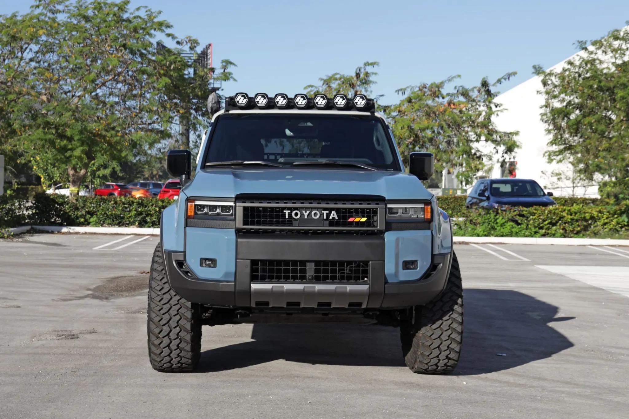 This 2024 Toyota Land Cruiser has been modified for display and off-road performance. It is powered by a turbocharged 2.4-liter i-Force Max inline-four hybrid system producing 326 horsepower and 465 lb-ft of torque, paired with an eight-speed automatic transmission and a dual-range transfer case. Power is delivered to all four wheels through a Torsen limited-slip center differential with locking center and rear differentials, as well as a factory Stabilizer Disconnect Mechanism, Crawl Control, and Downhill Assist Control.