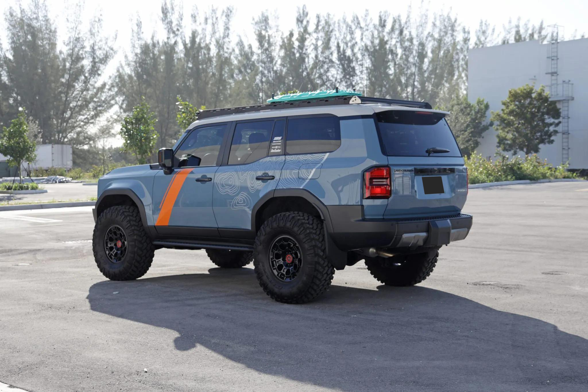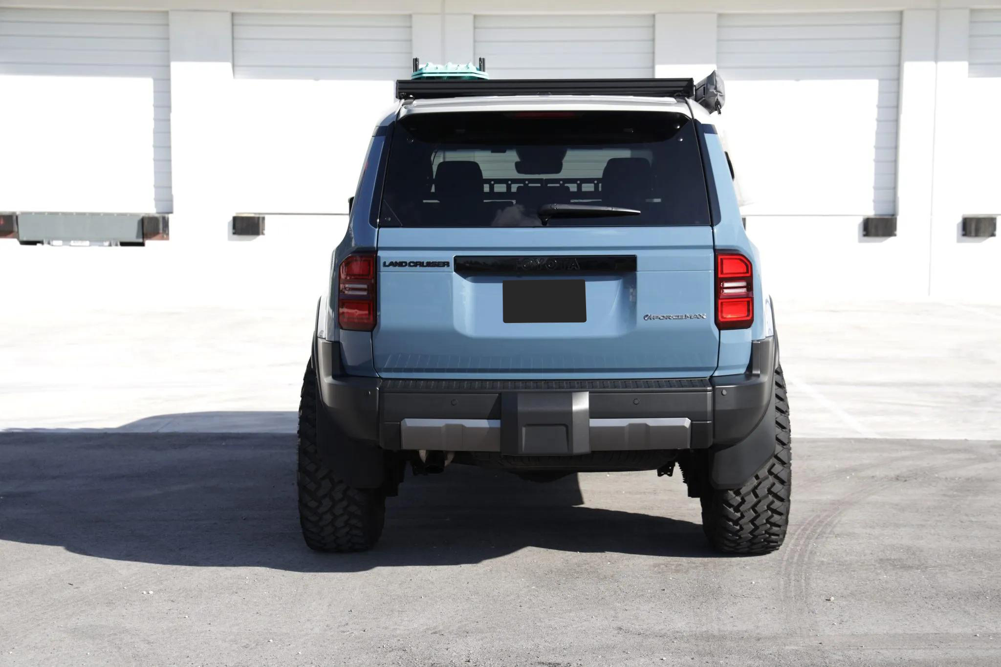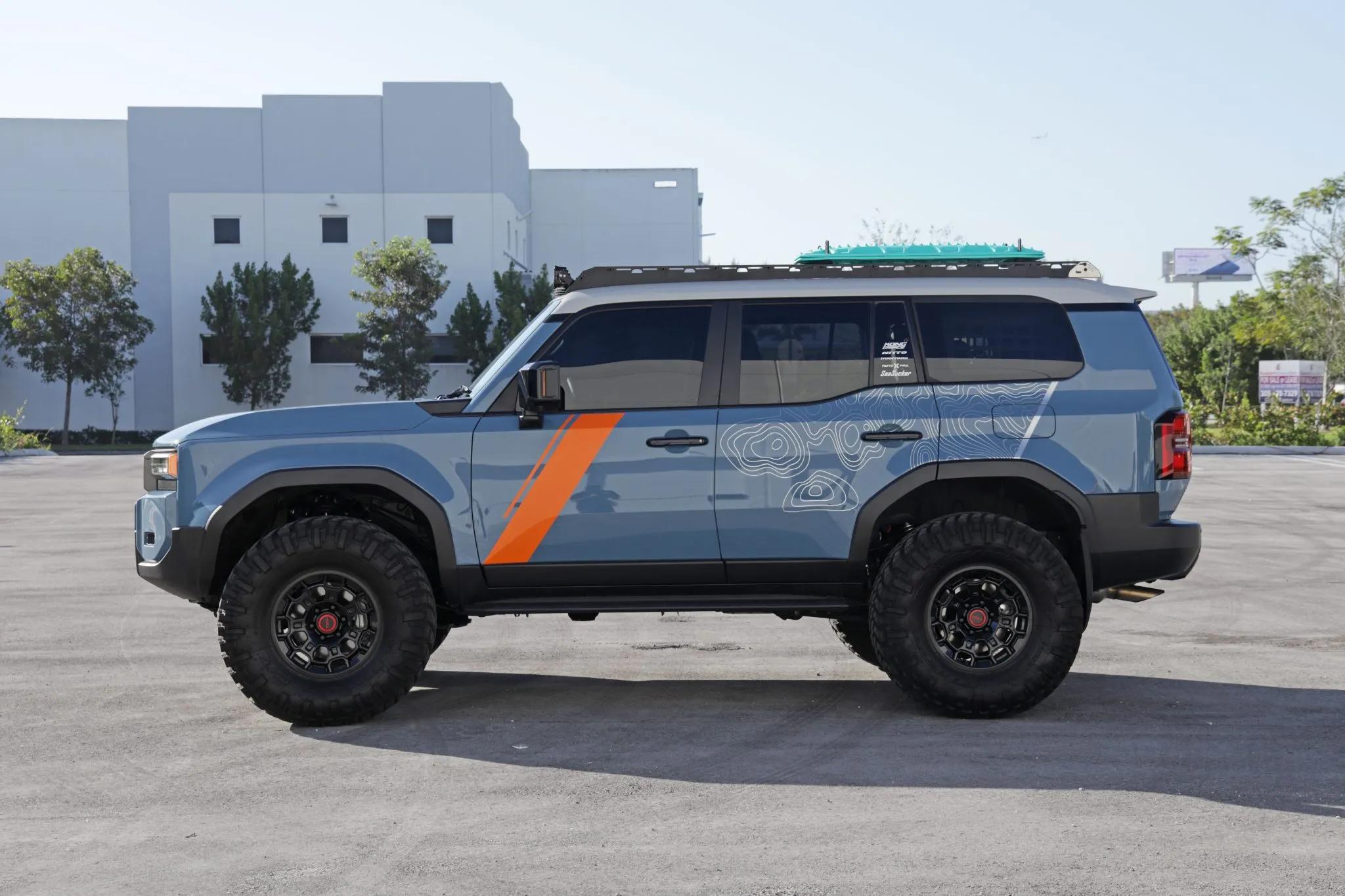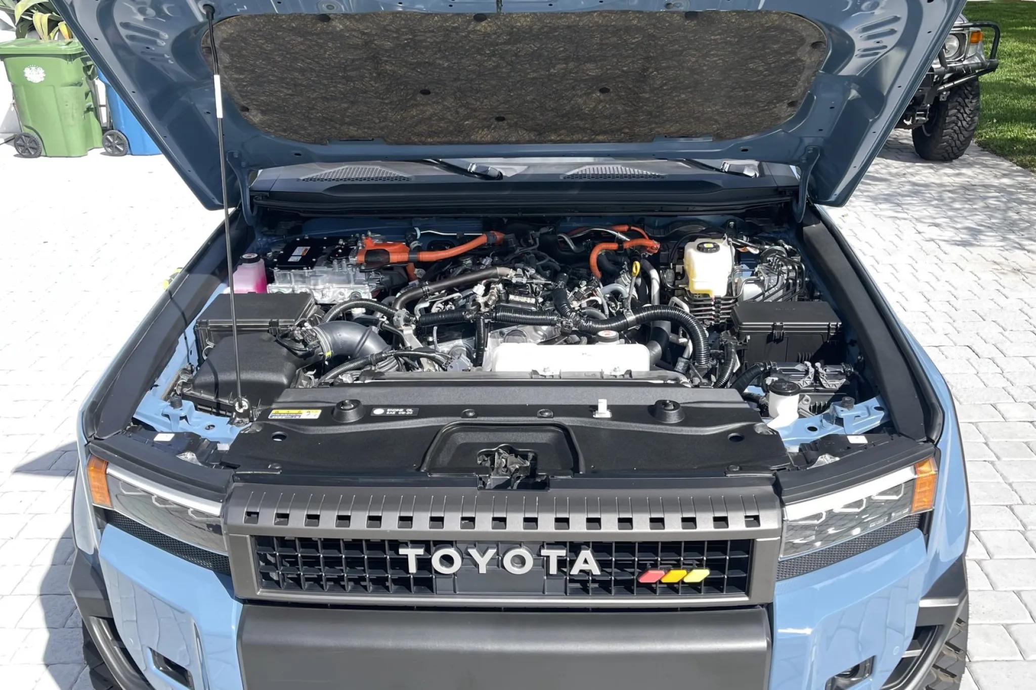 This 2024 Toyota Land Cruiser has been modified for display and off-road performance. It is powered by a turbocharged 2.4-liter i-Force Max inline-four hybrid system producing 326 horsepower and 465 lb-ft of torque, paired with an eight-speed automatic transmission and a dual-range transfer case. Power is delivered to all four wheels through a Torsen limited-slip center differential with locking center and rear differentials, as well as a factory Stabilizer Disconnect Mechanism, Crawl Control, and Downhill Assist Control.