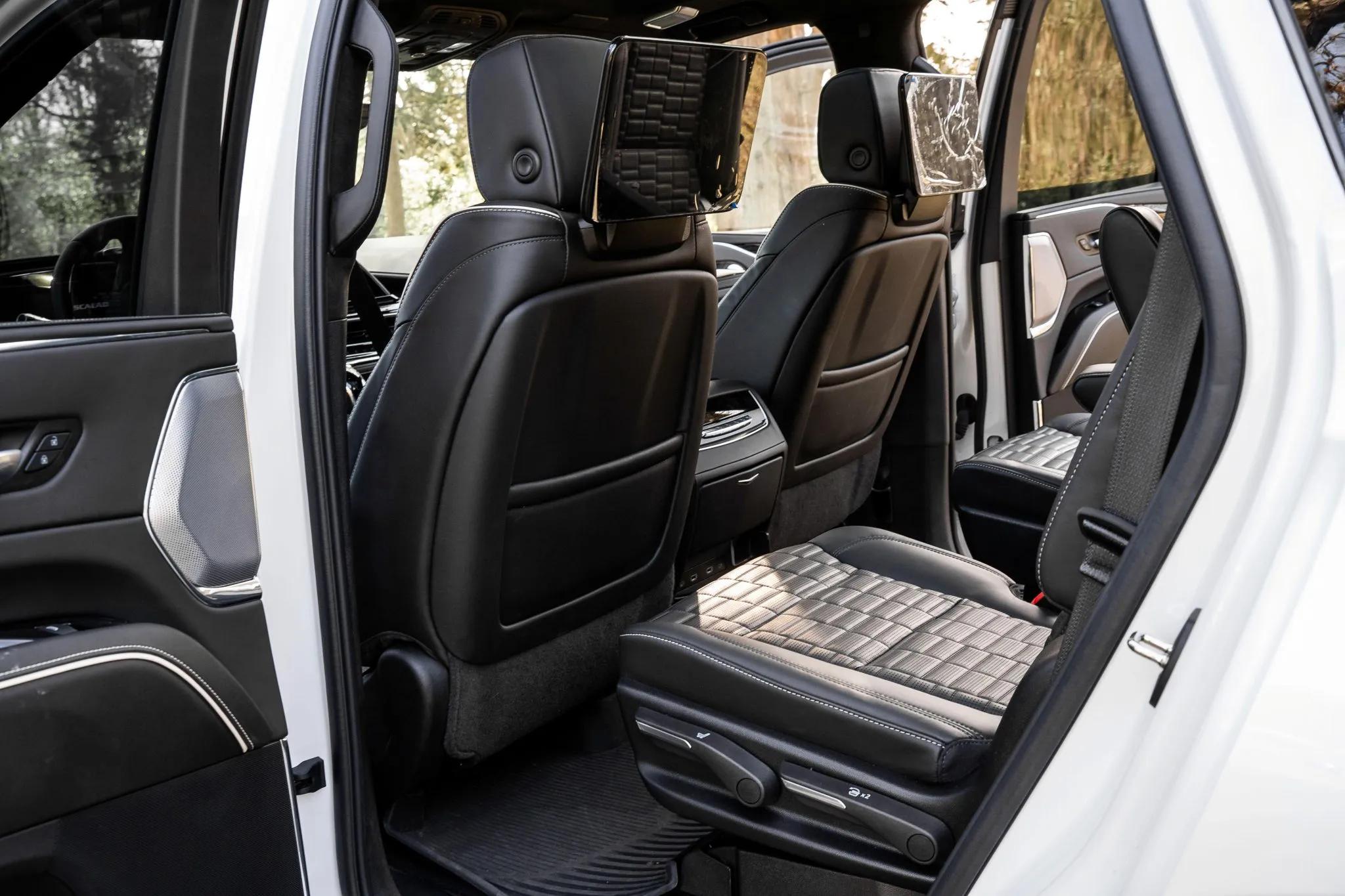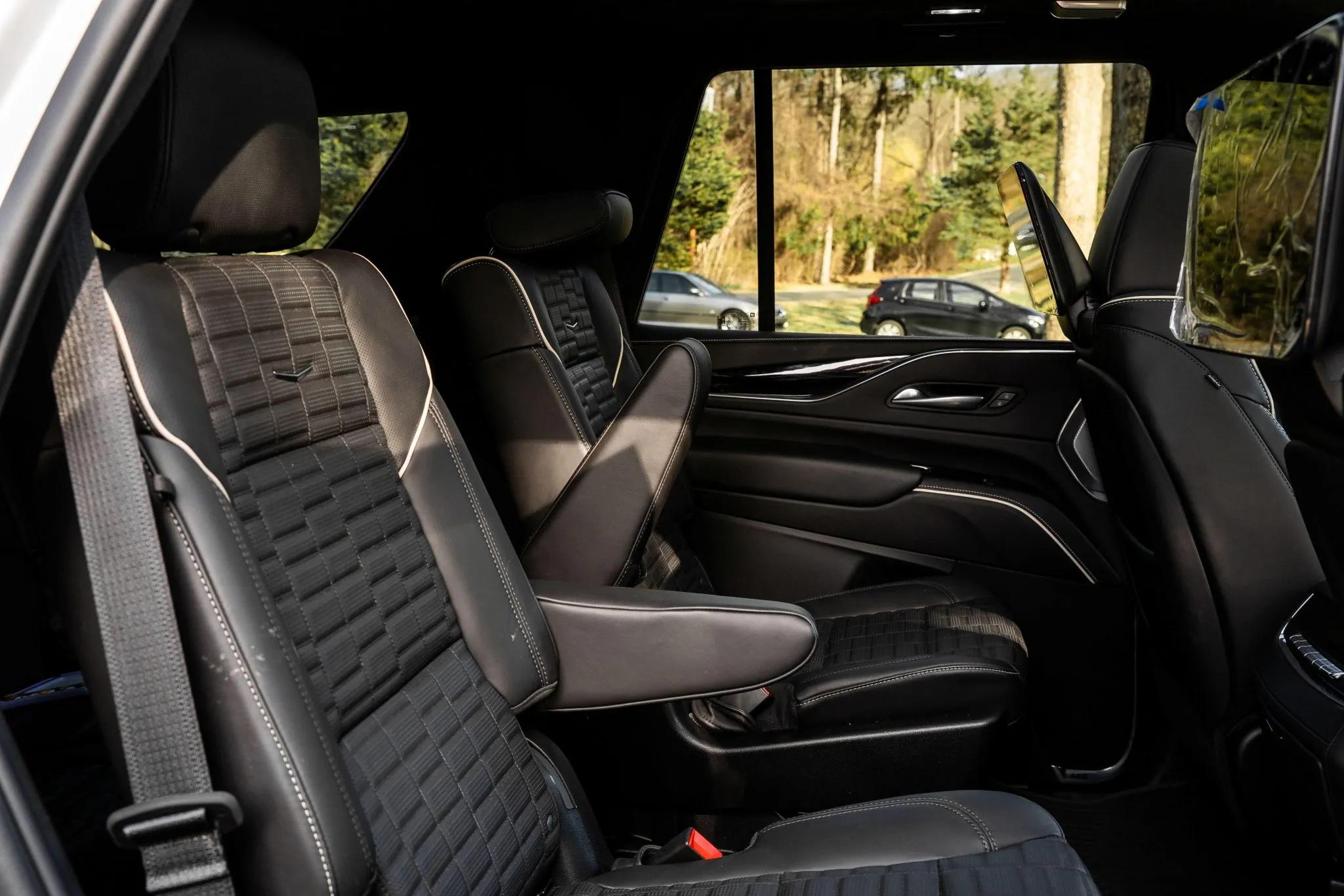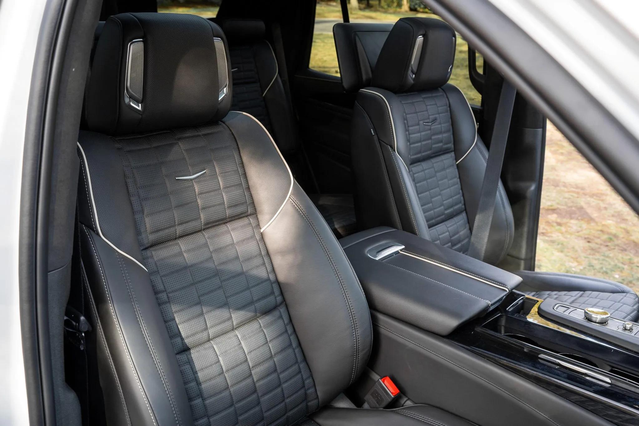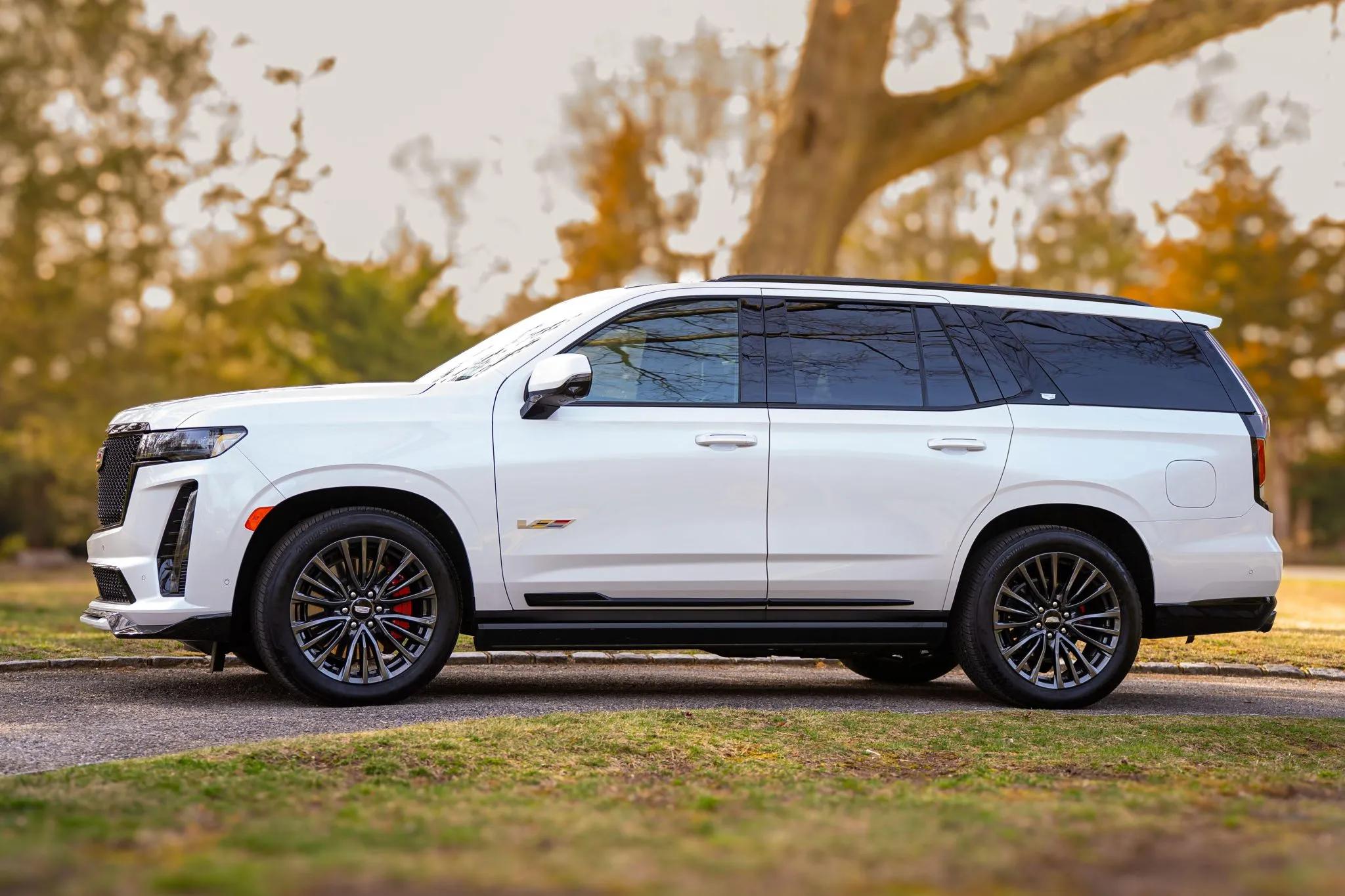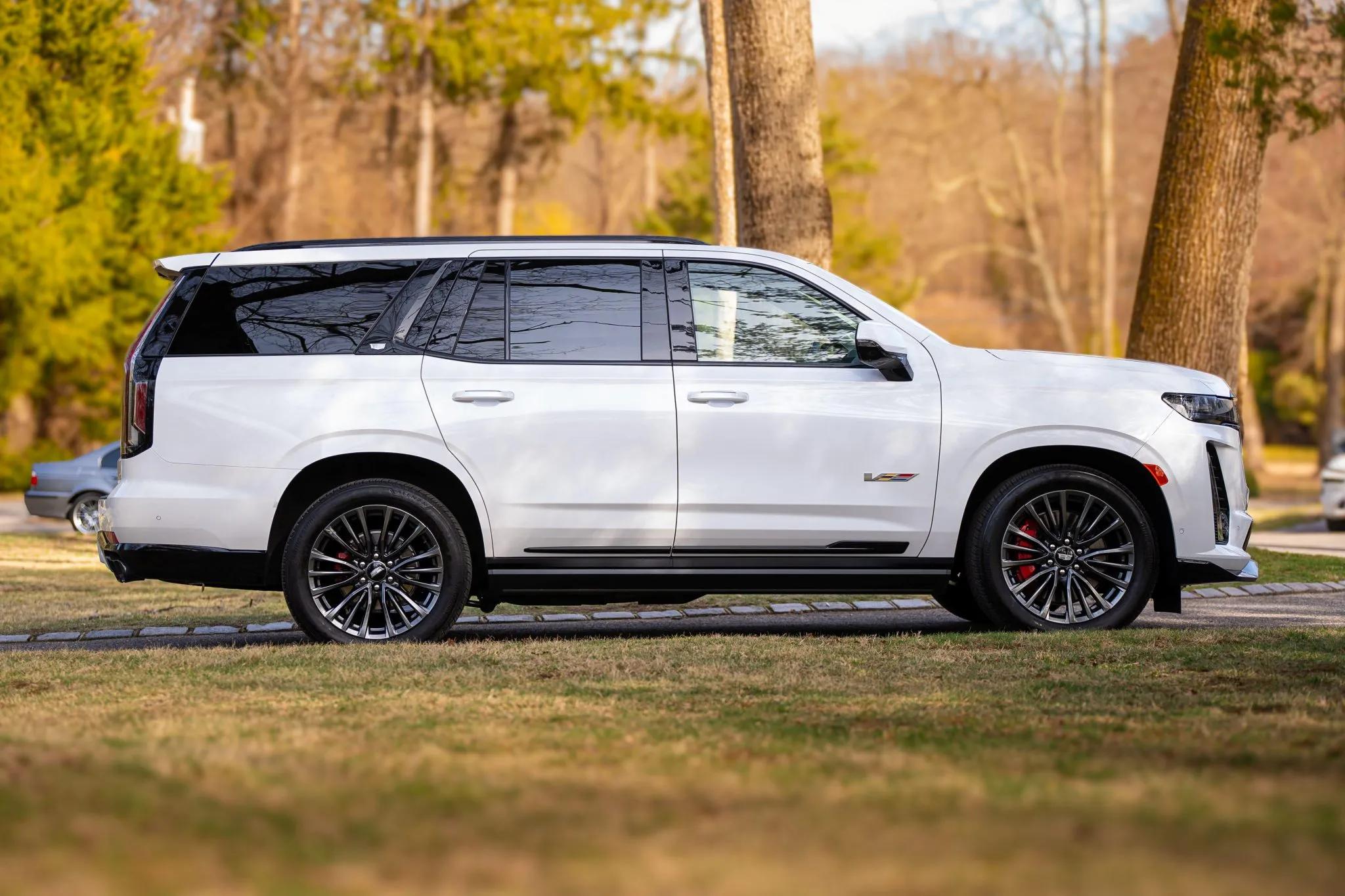 The exterior is finished in Crystal White and features mesh front grilles, V-series badging, revised front and rear fascias, and quad exhaust outlets. Additional exterior equipment includes a panoramic sunroof, a surround-view camera system, LED lighting, a roof spoiler, a night vision camera, gray and silver Cadillac emblems, and power-deployable running boards. The vehicle rides on gray 22-inch 18-spoke alloy wheels fitted with Bridgestone Alenza A/S 02 tires. Stopping power comes from red-finished six-piston Brembo front calipers, and suspension is handled by Cadillac's Air Ride Adaptive Suspension with Magnetic Ride Control.