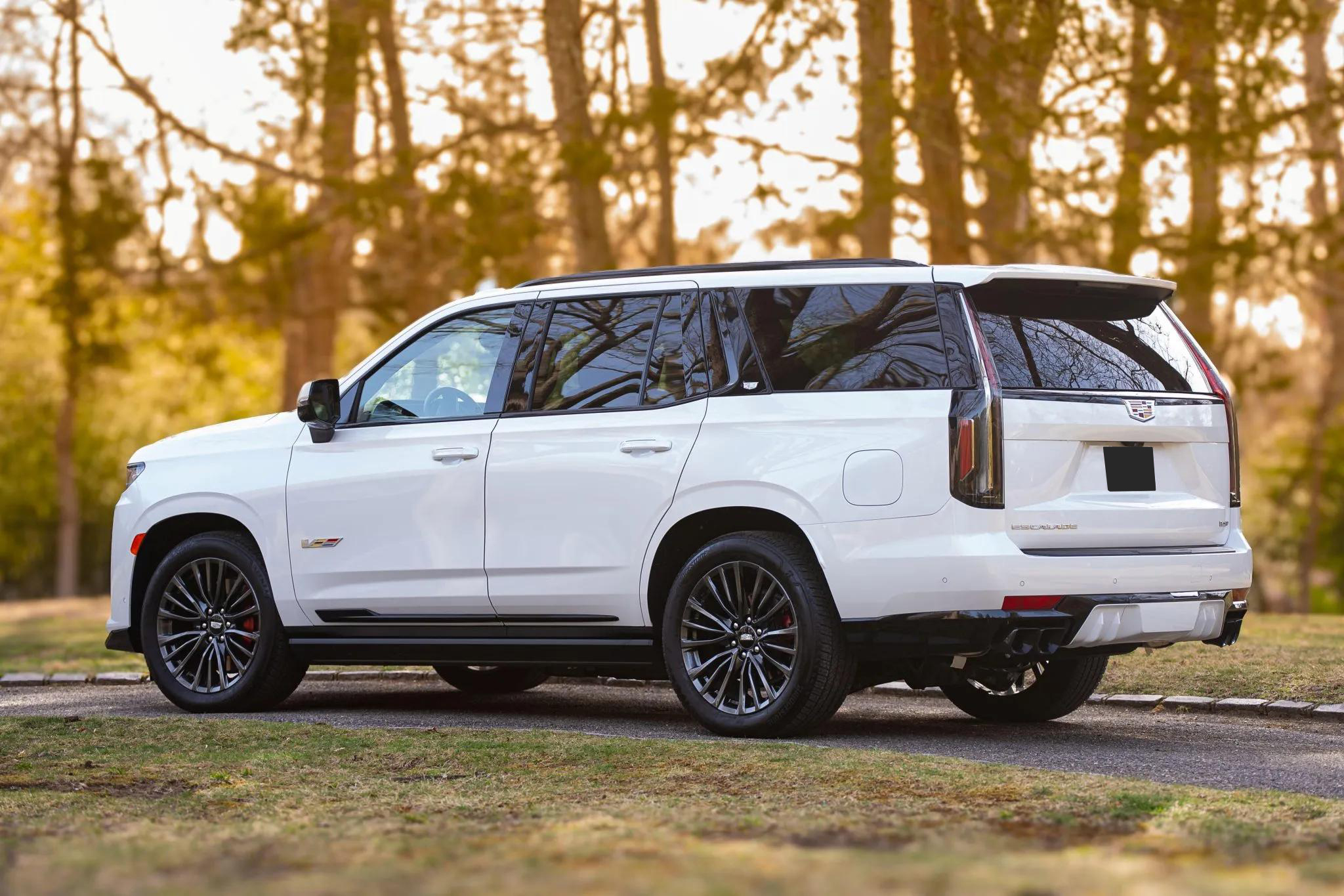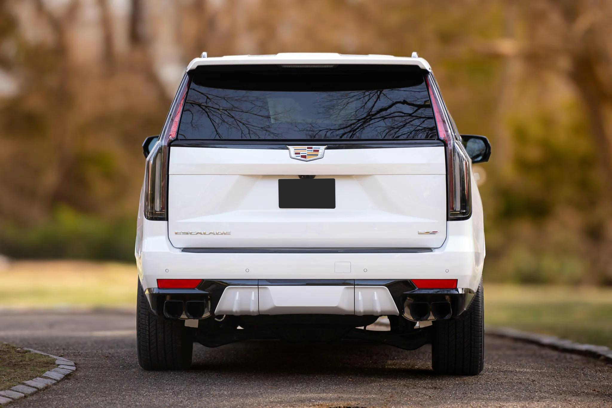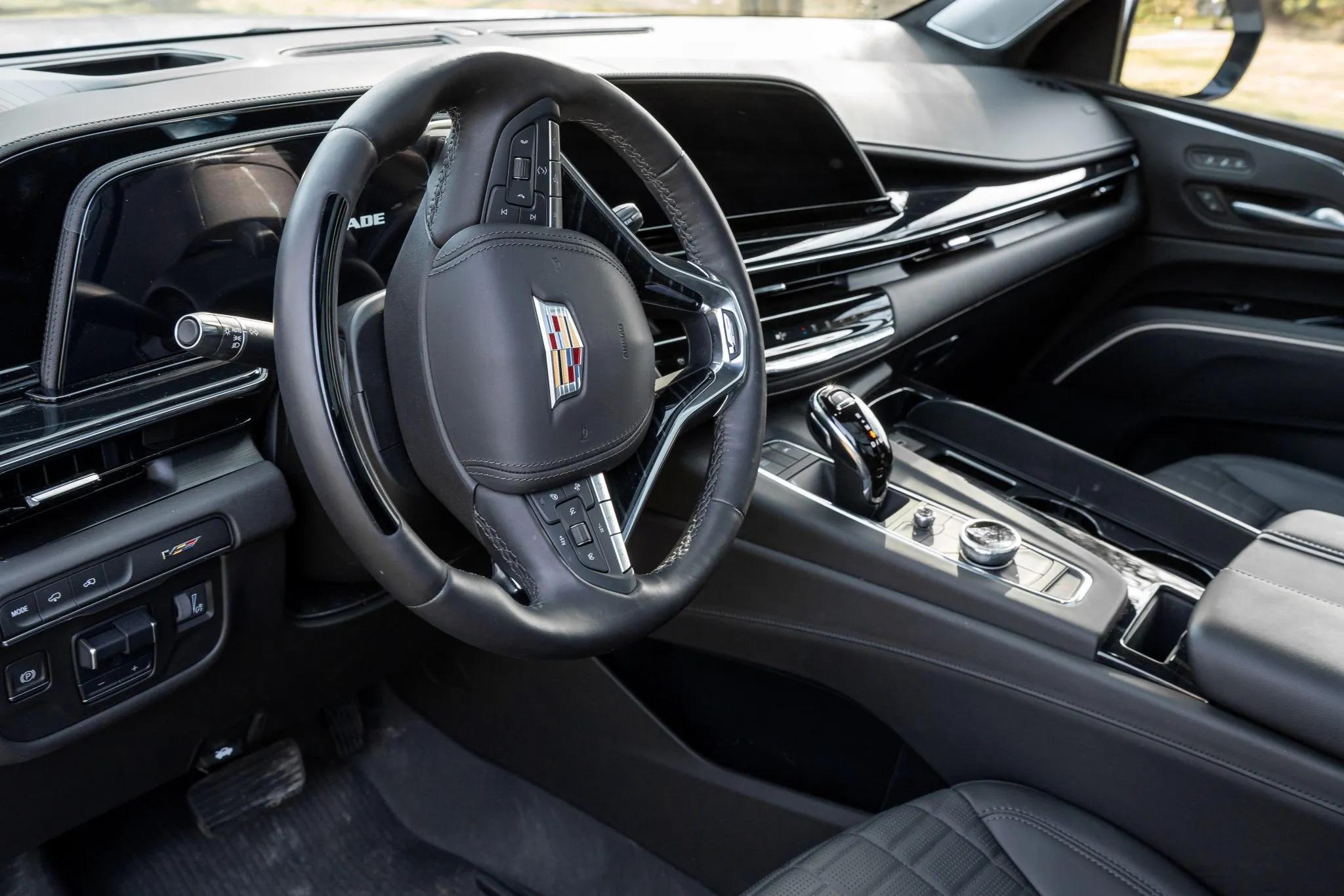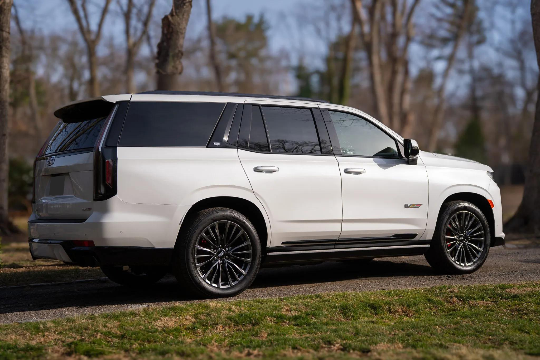 This 2023 Cadillac Escalade-V is powered by a supercharged and intercooled 6.2-liter V8 rated at 682 horsepower and 653 lb-ft of torque, paired with a 10-speed automatic transmission and an electronically controlled limited-slip differential.