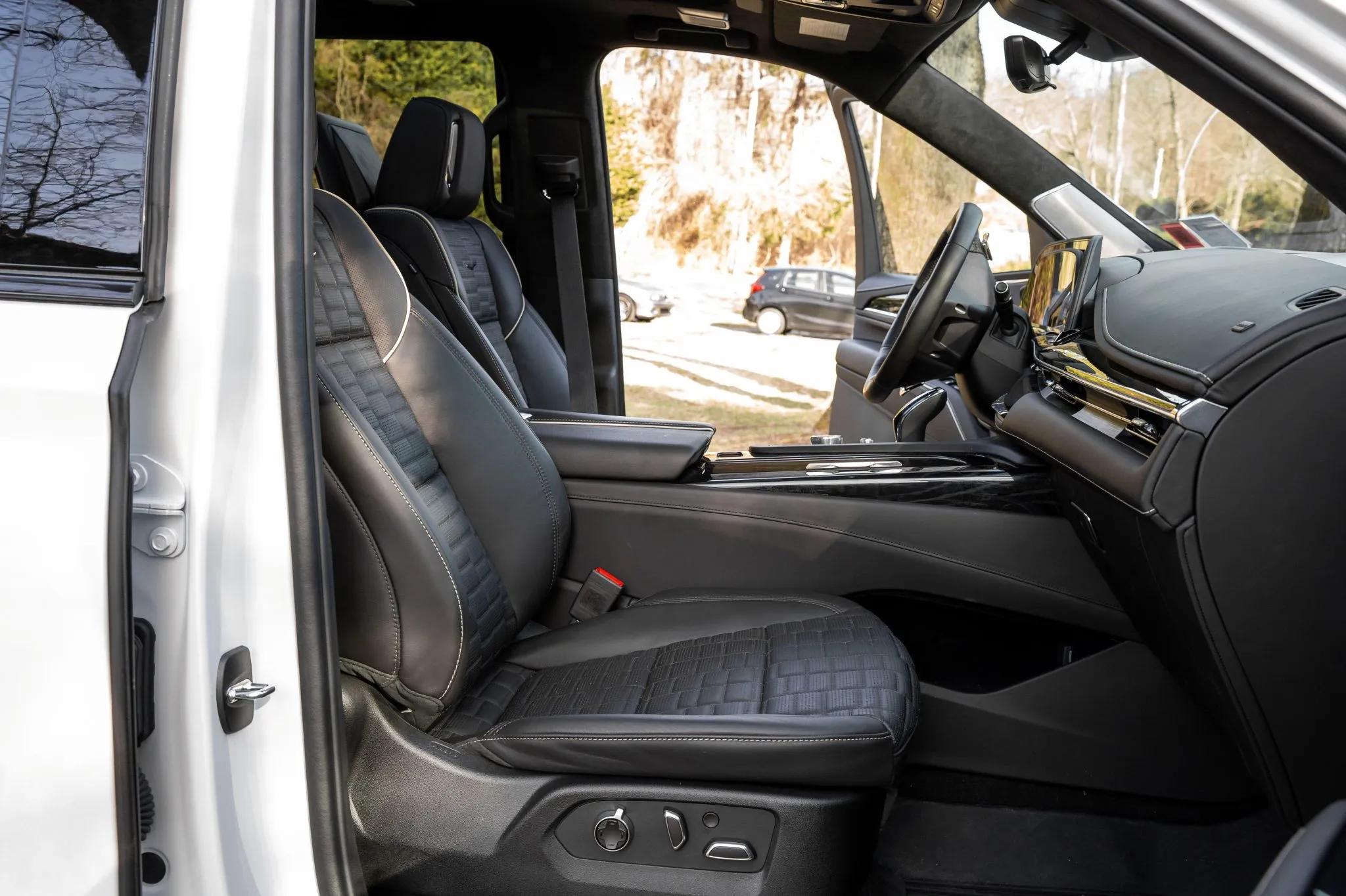 Inside, the cabin is trimmed in Jet Black semi-aniline leather with patterned inserts. The heated, ventilated, and power-adjustable front seats are complemented by heated rear captain's chairs and power-folding third-row seats. Interior amenities include multi-zone automatic climate control, a head-up display, a rearview camera mirror, and a console refrigerator-freezer. The infotainment system features a curved 16.9-inch OLED touchscreen with wireless Android Auto and Apple CarPlay, integrated with a 36-speaker AKG Studio Reference sound system. Rear-seat entertainment screens are also included.