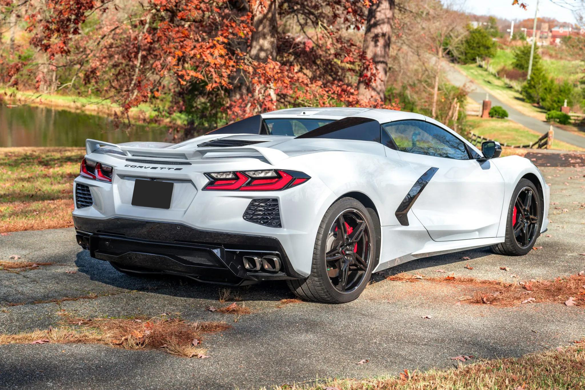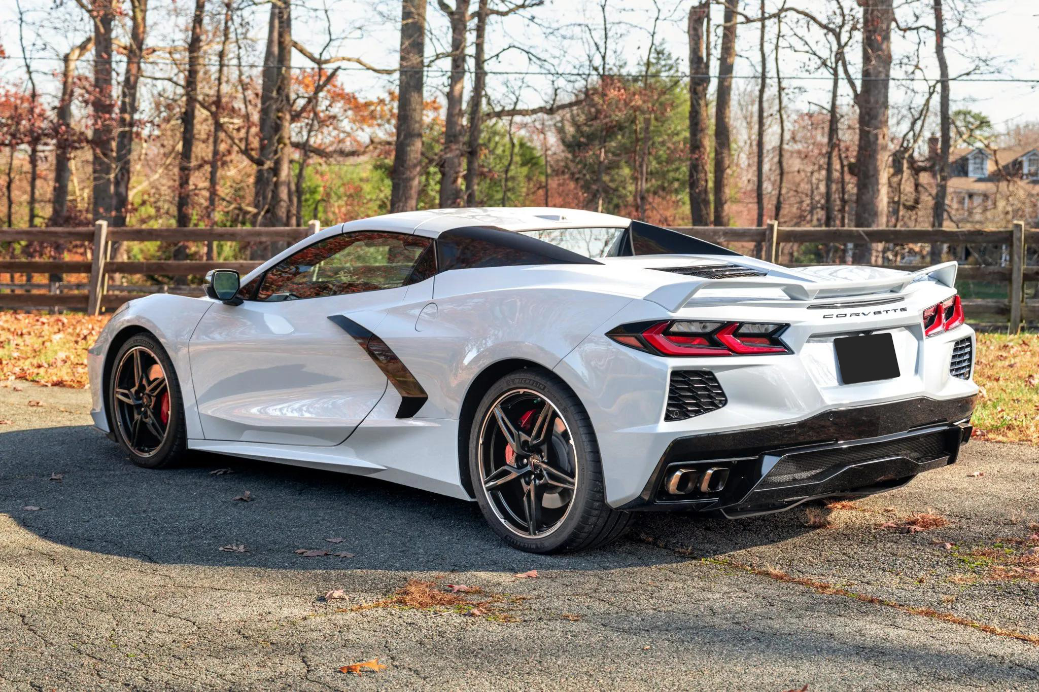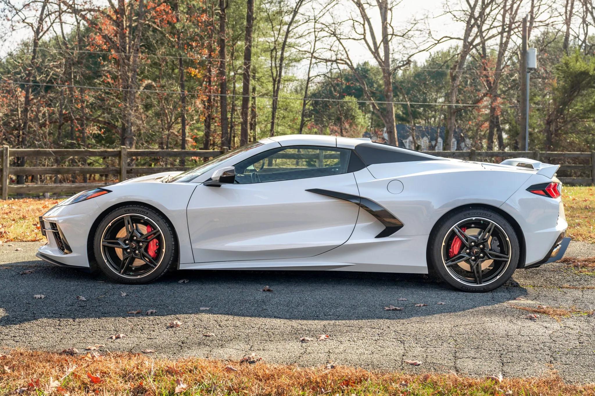 The exterior features a power-retractable hardtop, LED headlights, power-folding mirrors, front and rear cameras, rear Park Assist sensors, a Z51 rear spoiler, and quad exhaust outlets. The body and wheels received a ceramic coating in 2023. Black 19-inch front and 20-inch rear five-spoke alloy wheels are mounted with Michelin Pilot Sport 4S tires. The Z51 Performance Package adds a revised suspension, heavy-duty cooling, and performance brakes with Bright Red Z51-branded Brembo calipers. The car is also equipped with Magnetic Selective Ride Control.