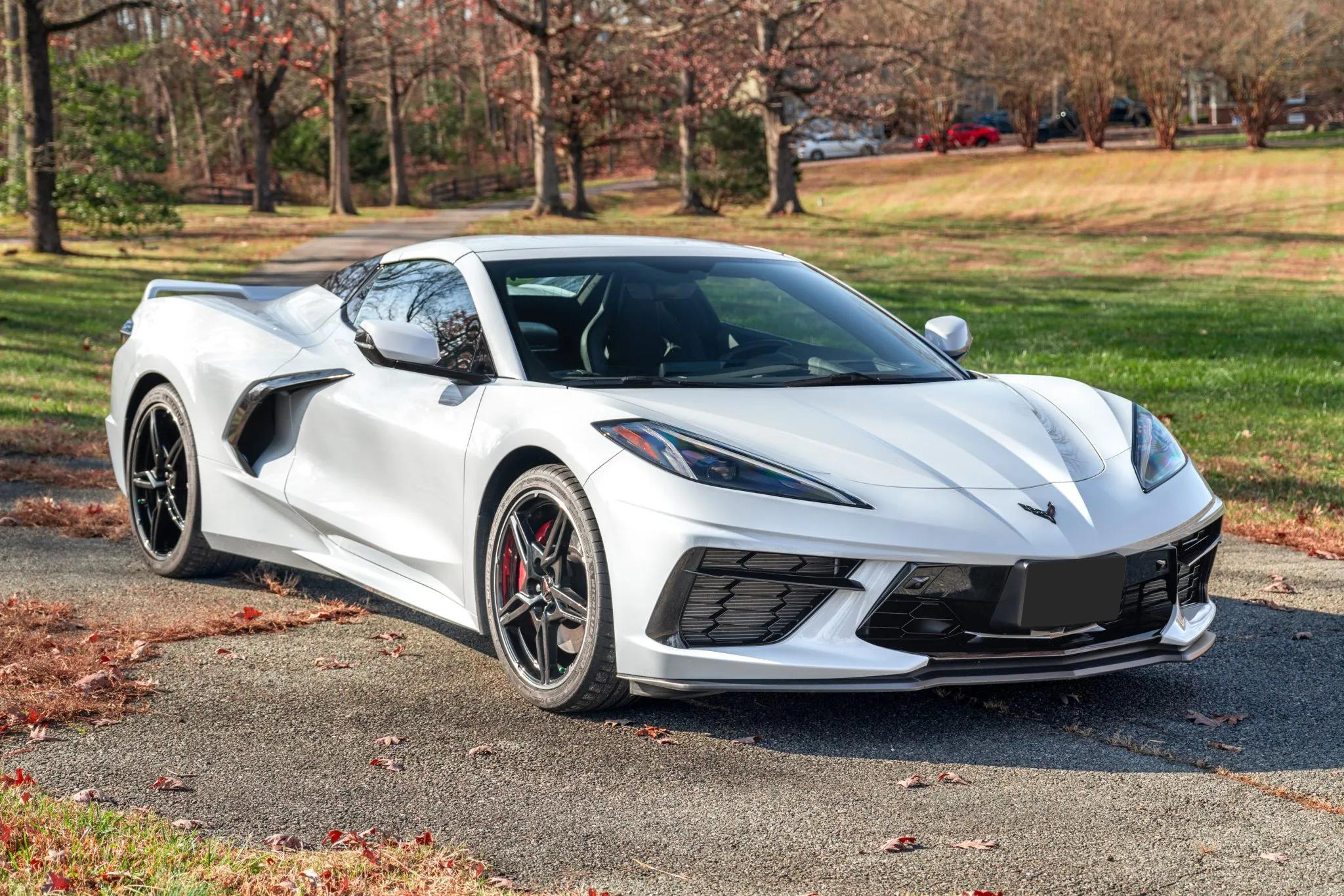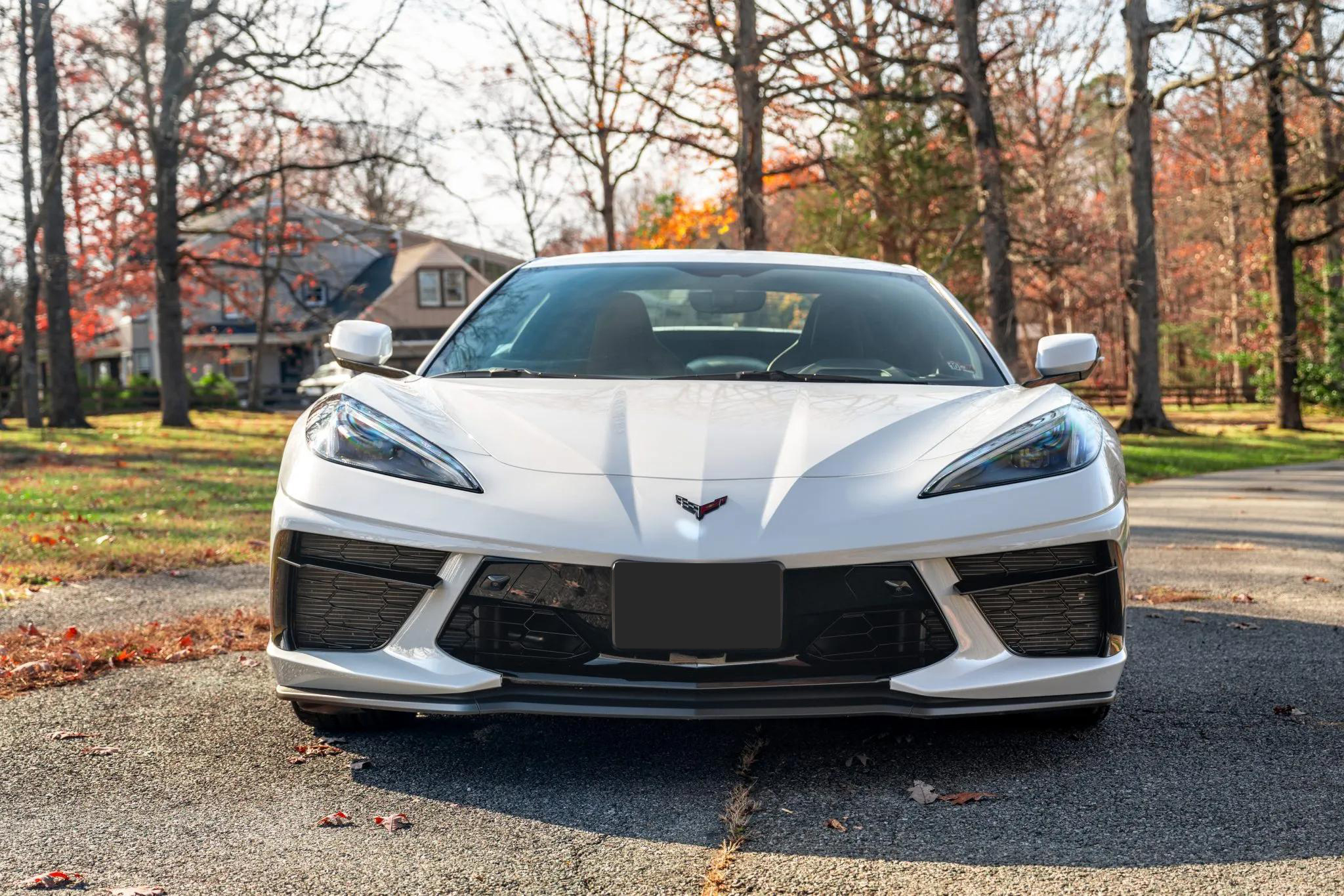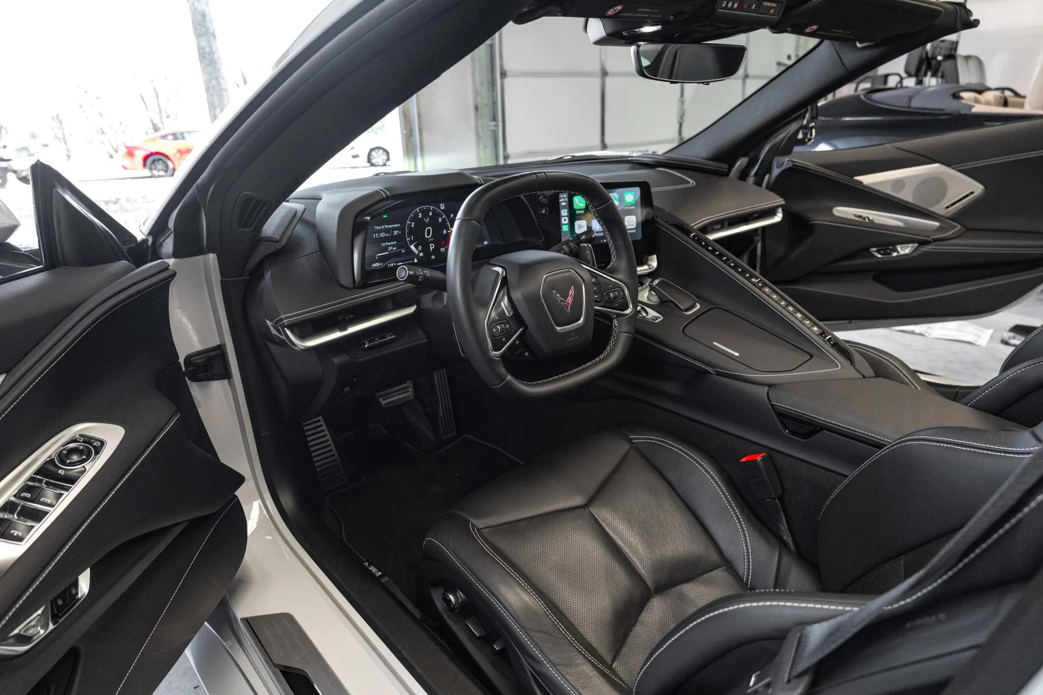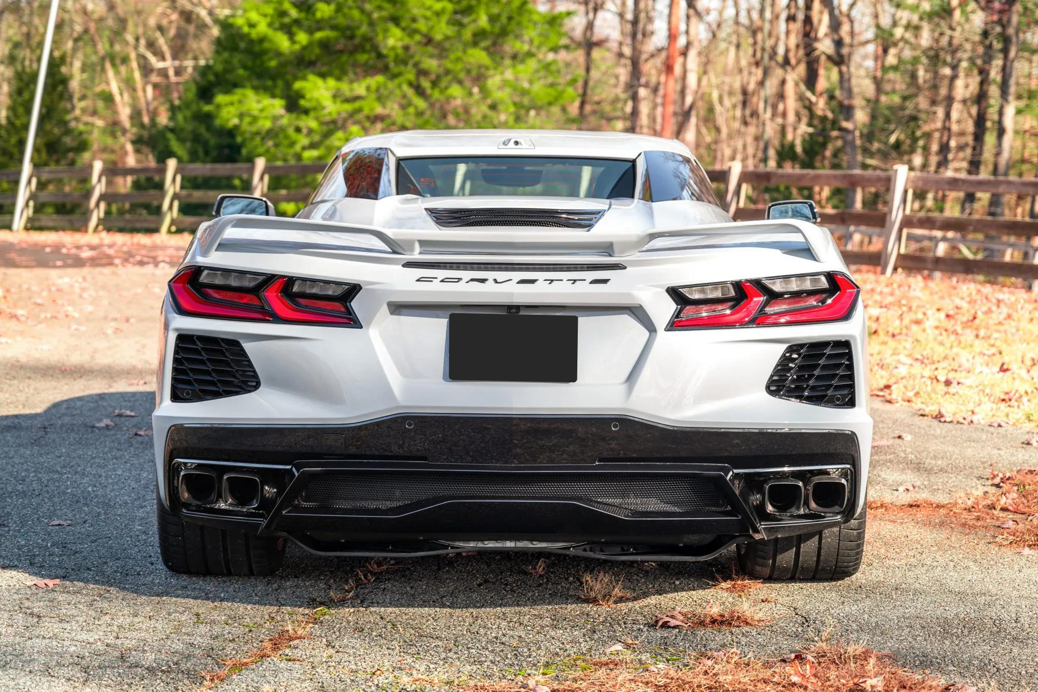 The exterior features a power-retractable hardtop, LED headlights, power-folding mirrors, front and rear cameras, rear Park Assist sensors, a Z51 rear spoiler, and quad exhaust outlets. The body and wheels received a ceramic coating in 2023. Black 19-inch front and 20-inch rear five-spoke alloy wheels are mounted with Michelin Pilot Sport 4S tires. The Z51 Performance Package adds a revised suspension, heavy-duty cooling, and performance brakes with Bright Red Z51-branded Brembo calipers. The car is also equipped with Magnetic Selective Ride Control.