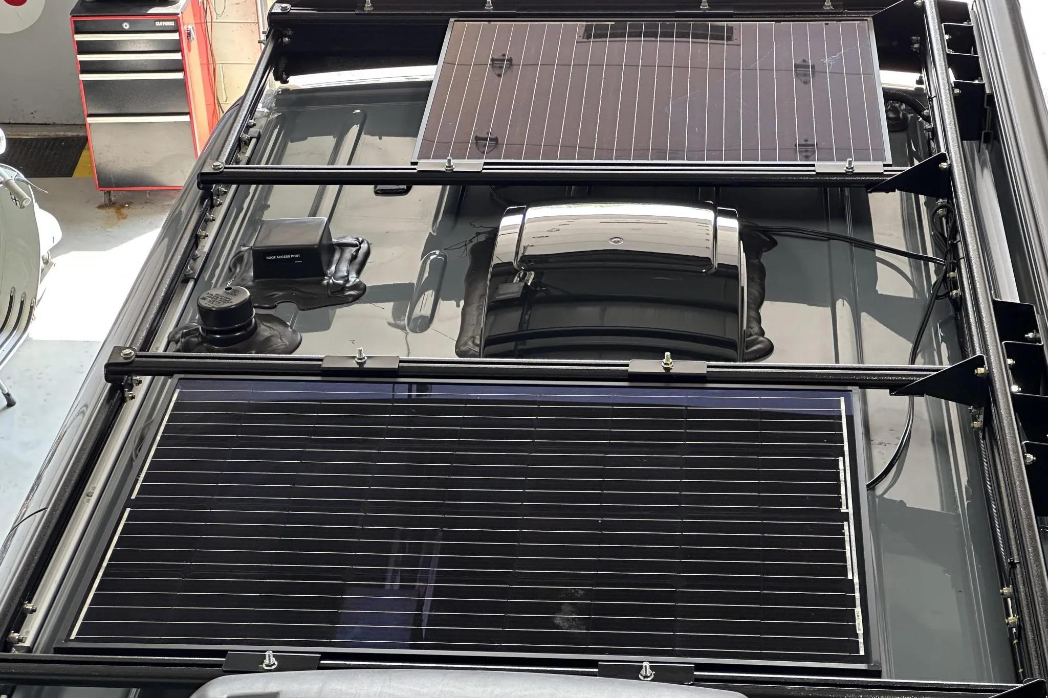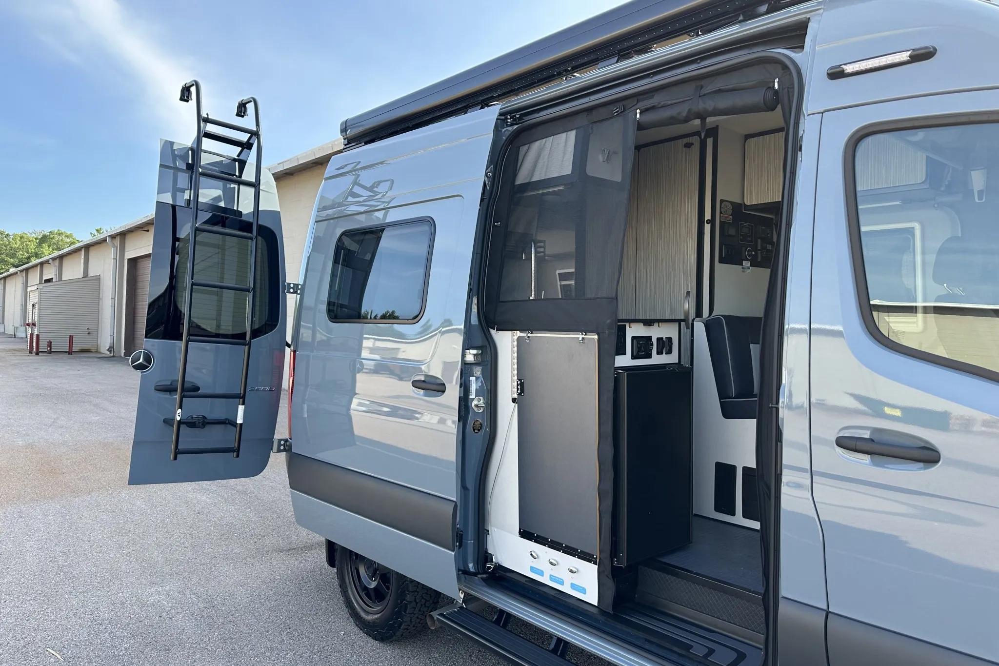 Finished in Blue Grey, the van features an extended-height roof, a roof rack, roof-mounted solar panels, a side awning, a rear ladder, side steps, parking sensors, a receiver hitch, and external utility hookups. Additional equipment includes a roof-mounted Coleman air conditioner and an Electronic Stability Program (ESP). The 17-inch Method Race wheels are fitted with 245/70 BFGoodrich All-Terrain T/A KO2 tires, and braking is handled by discs at all four corners.