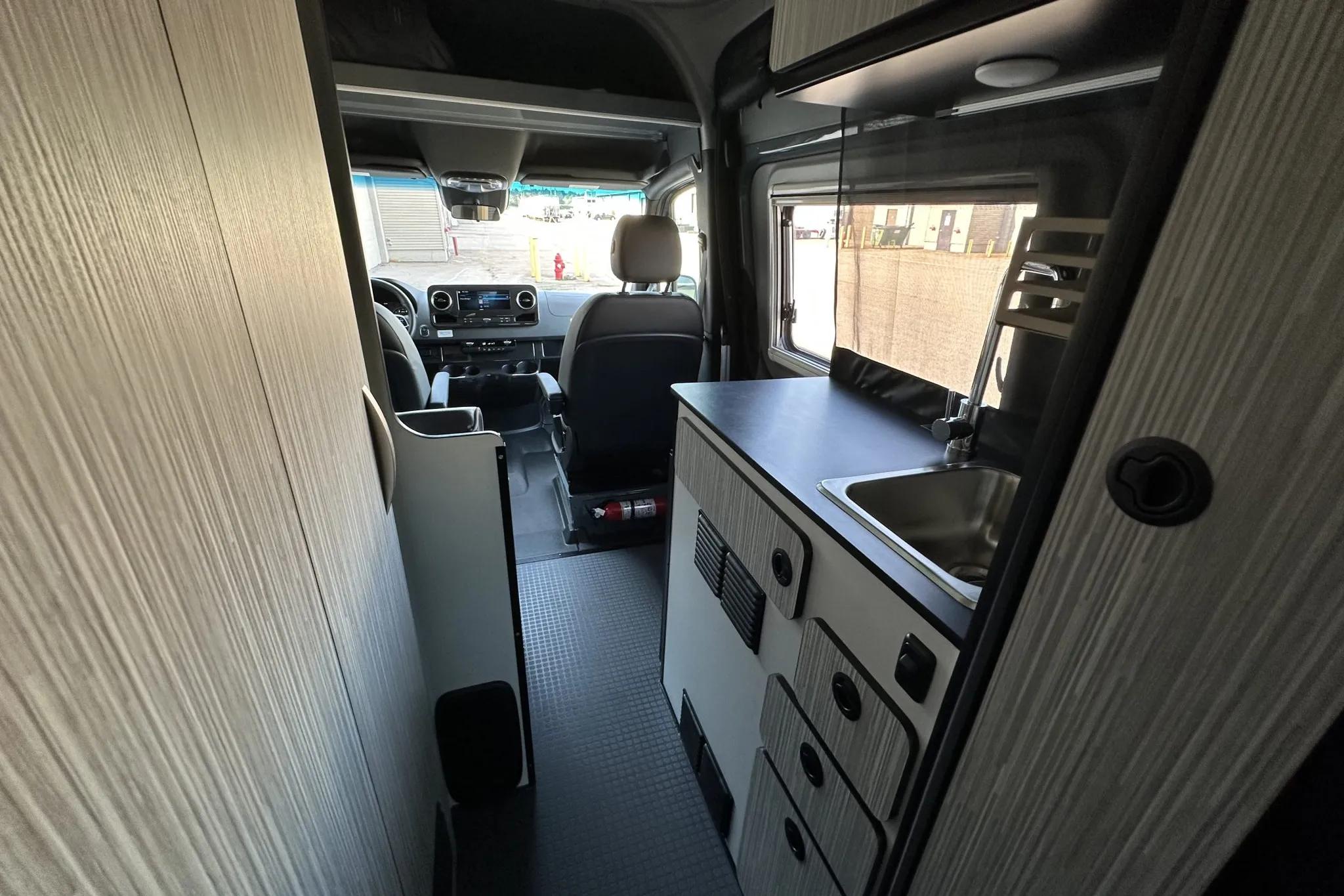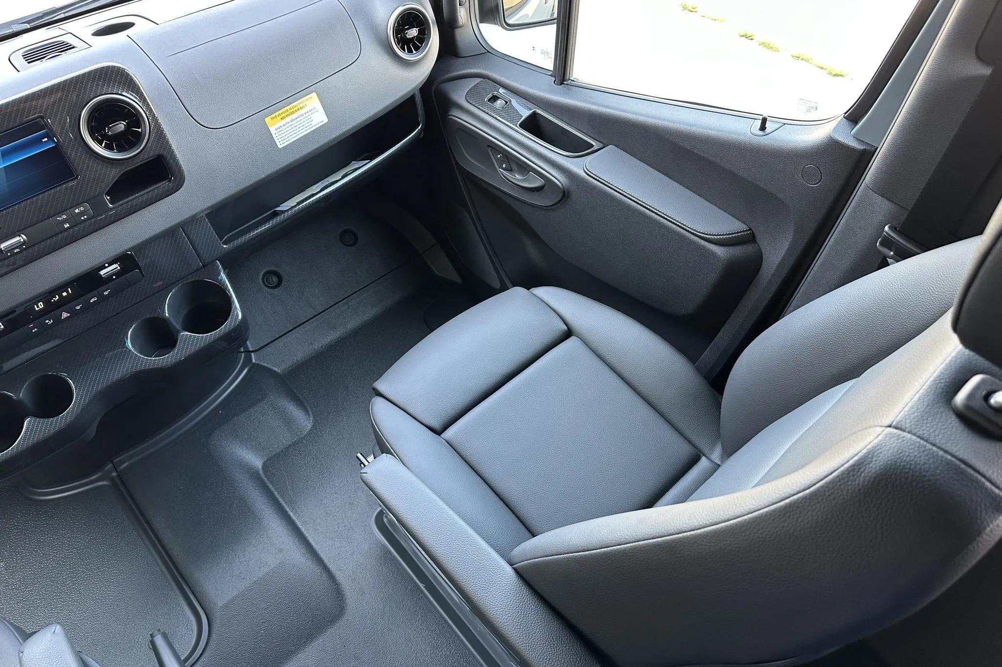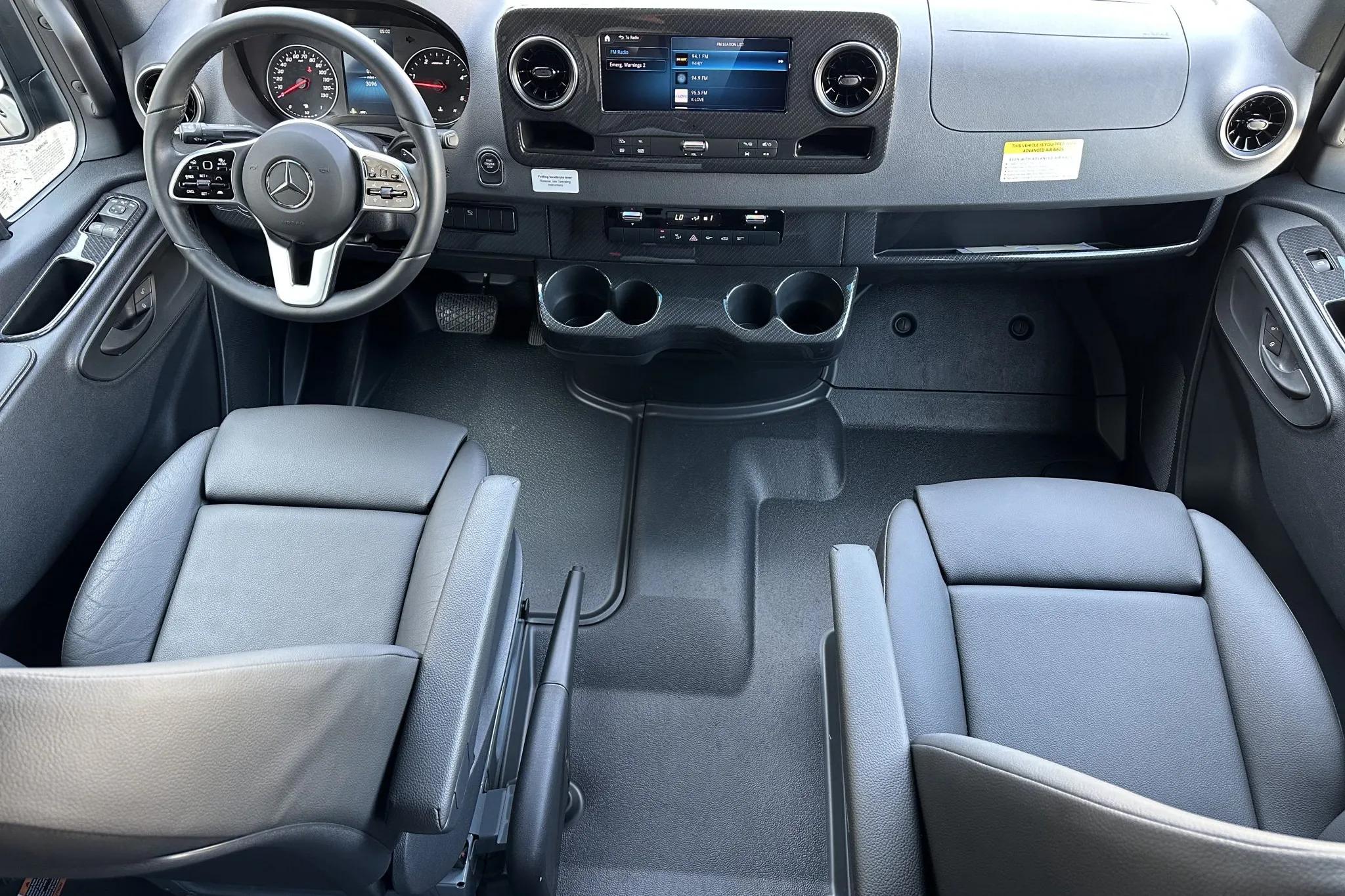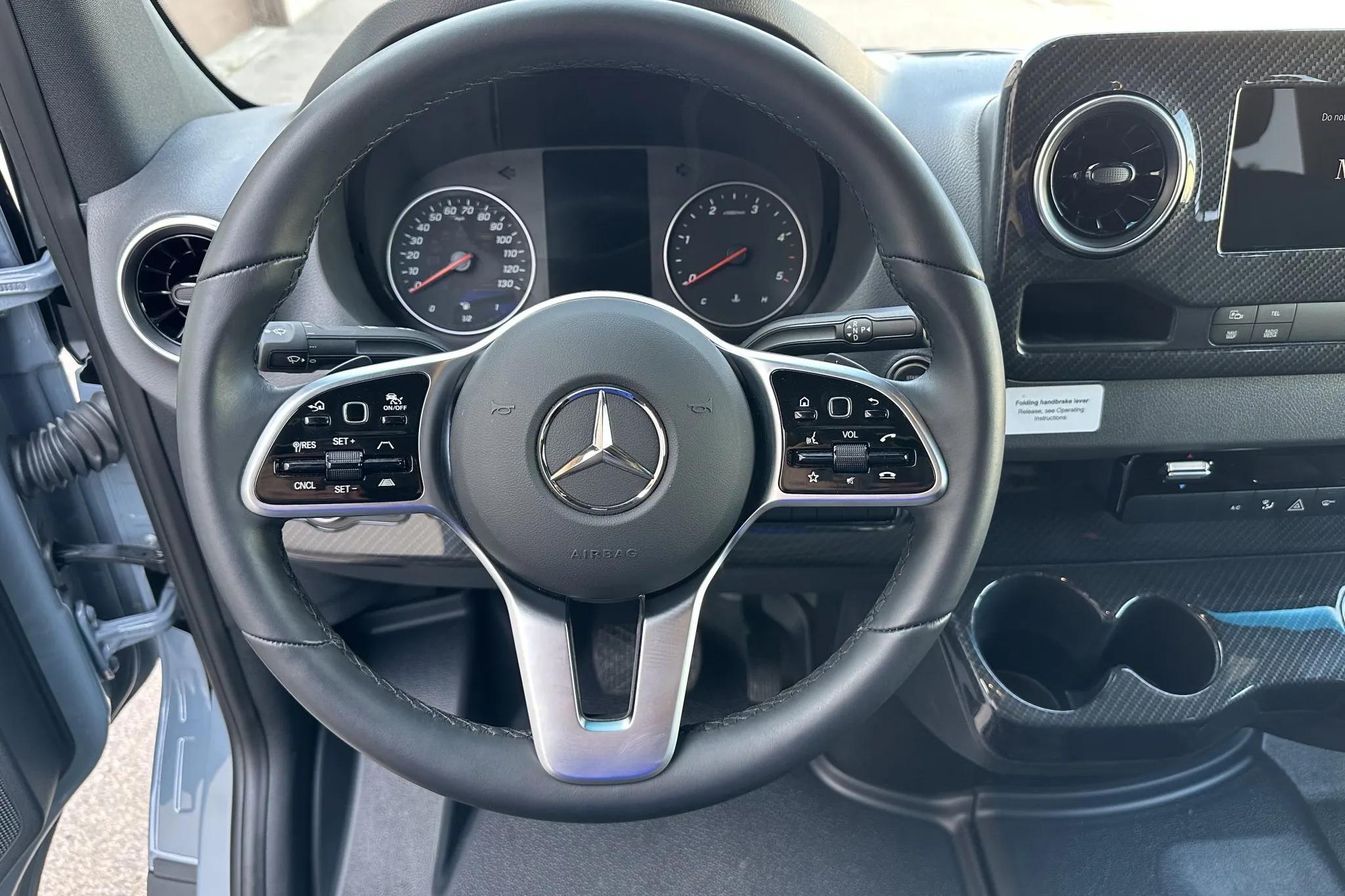 The front cabin features swiveling captain's chairs trimmed in black upholstery along with air conditioning, Distronic adaptive cruise control, crosswind assist, a surround-view camera system, and Mercedes' MBUX infotainment system with a 10.25-inch touchscreen and navigation. The leather-wrapped multifunction steering wheel frames a 130-mph speedometer, a 5k-rpm tachometer, and a digital display.