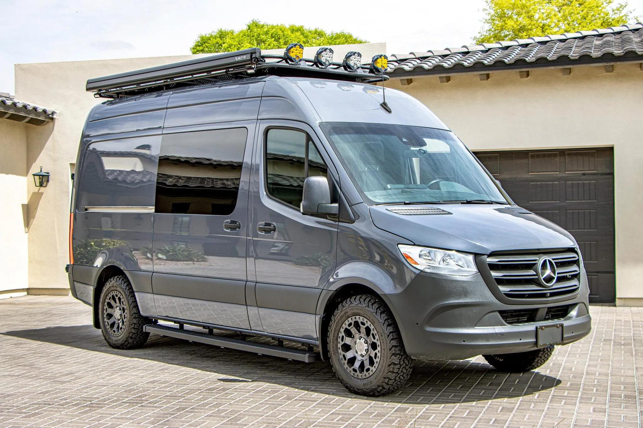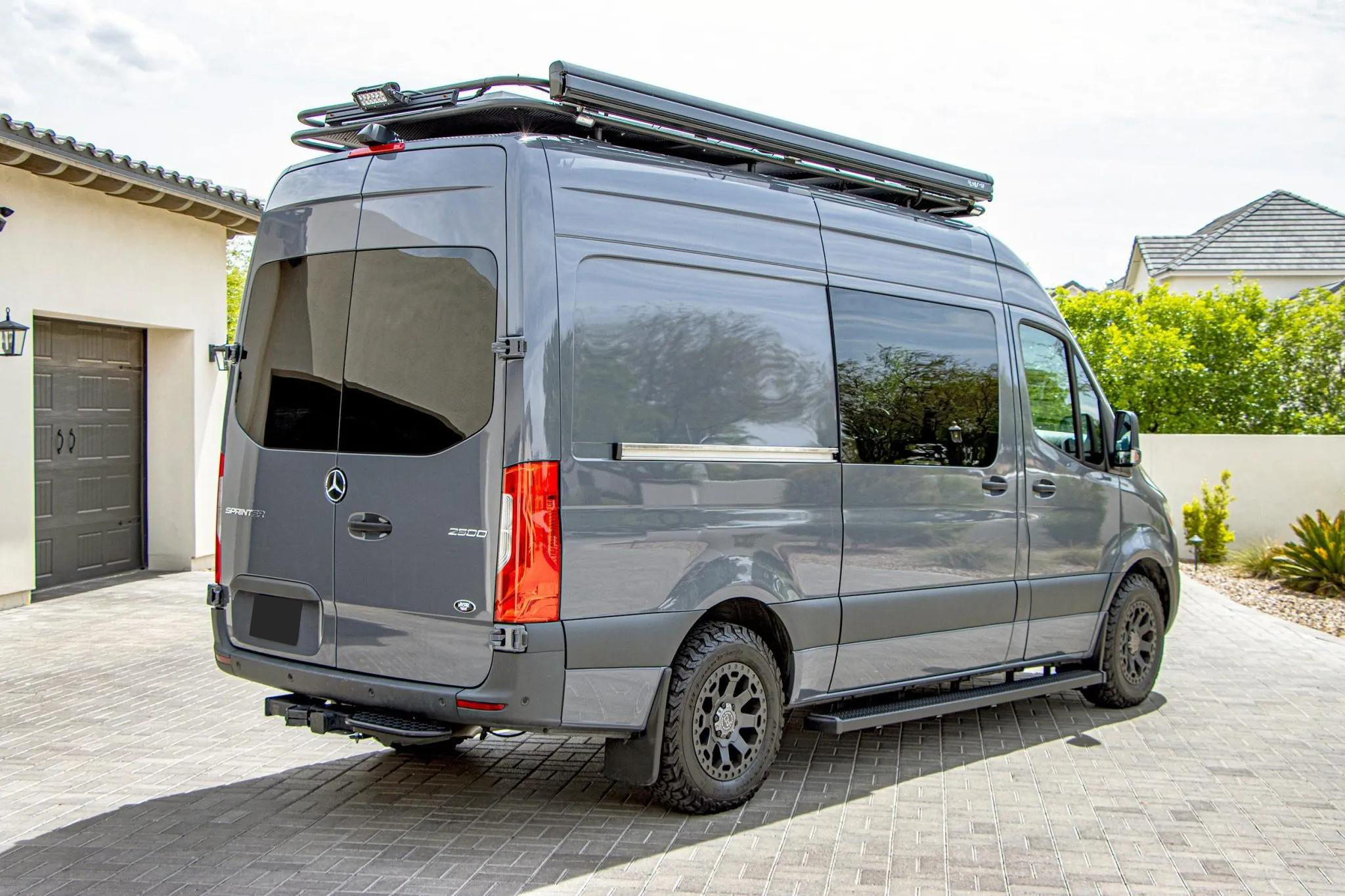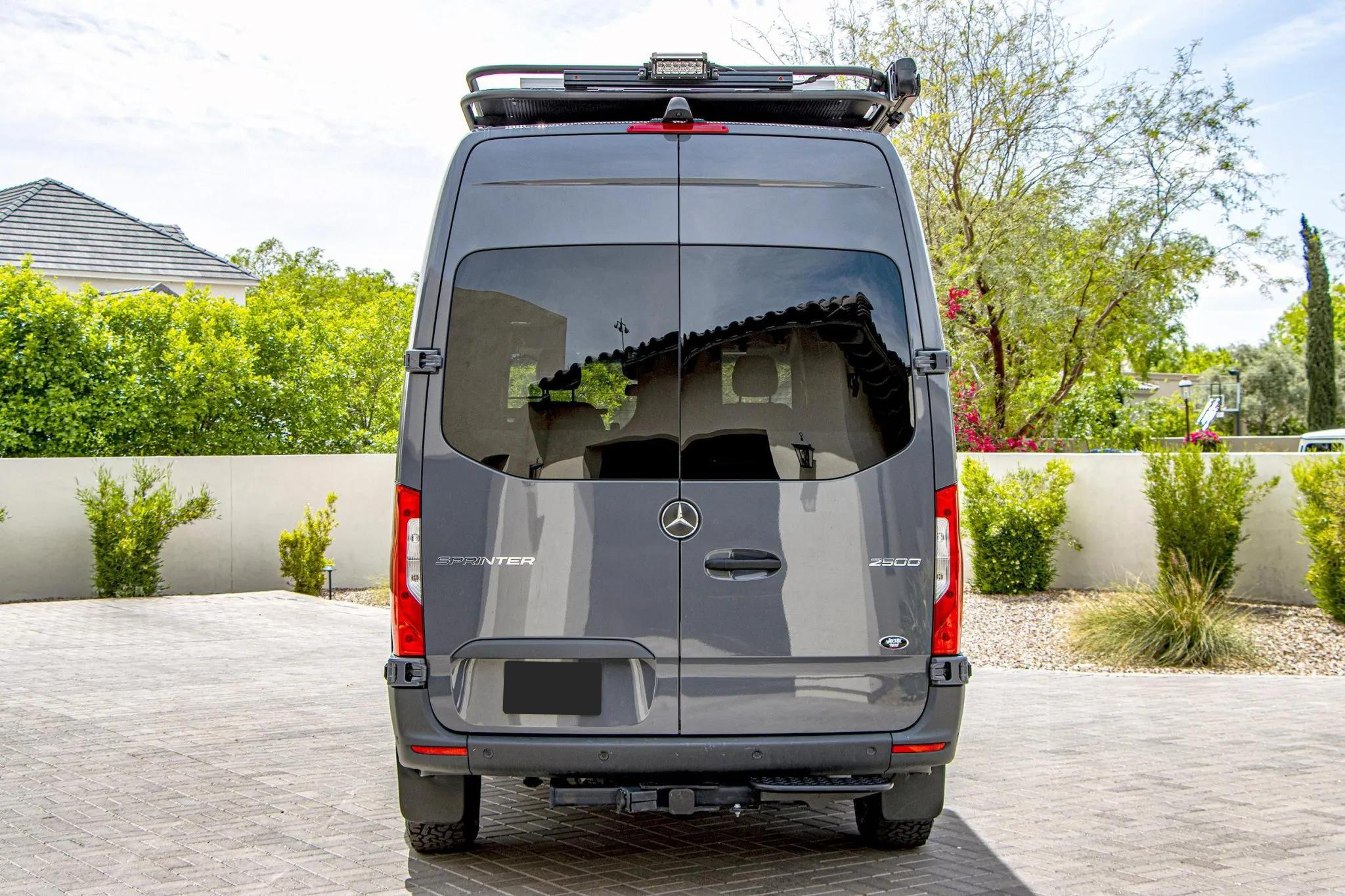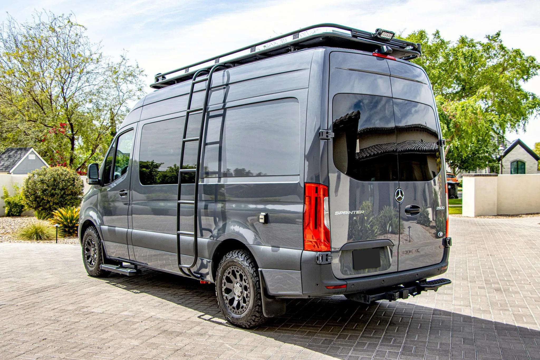 Finished in Pebble Grey over black leatherette, this high-roof Sprinter 2500 is powered by a 2.1-liter turbodiesel I4 producing 166 horsepower and 266 lb-ft of torque, paired with a seven-speed automatic transmission and rear-wheel drive.