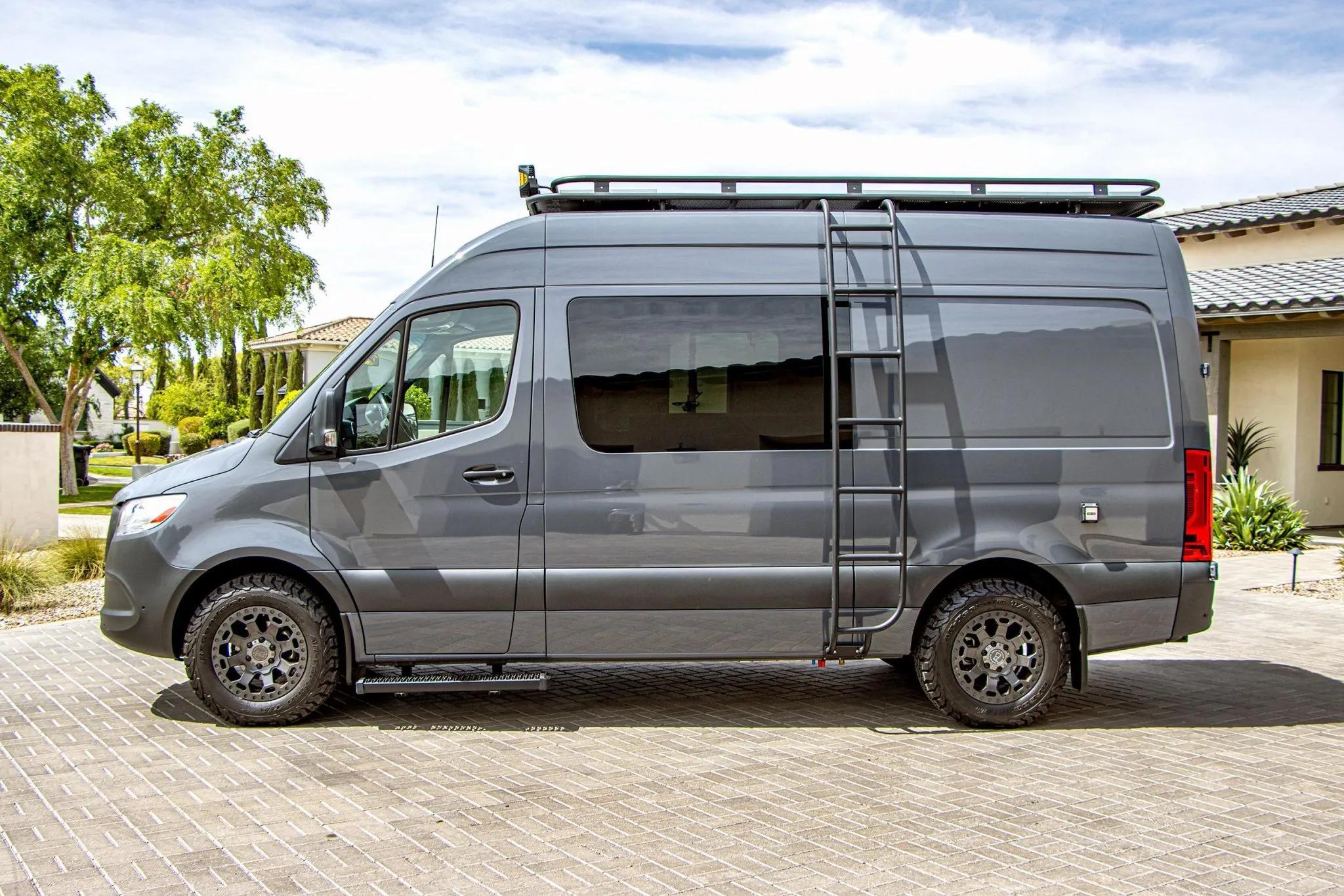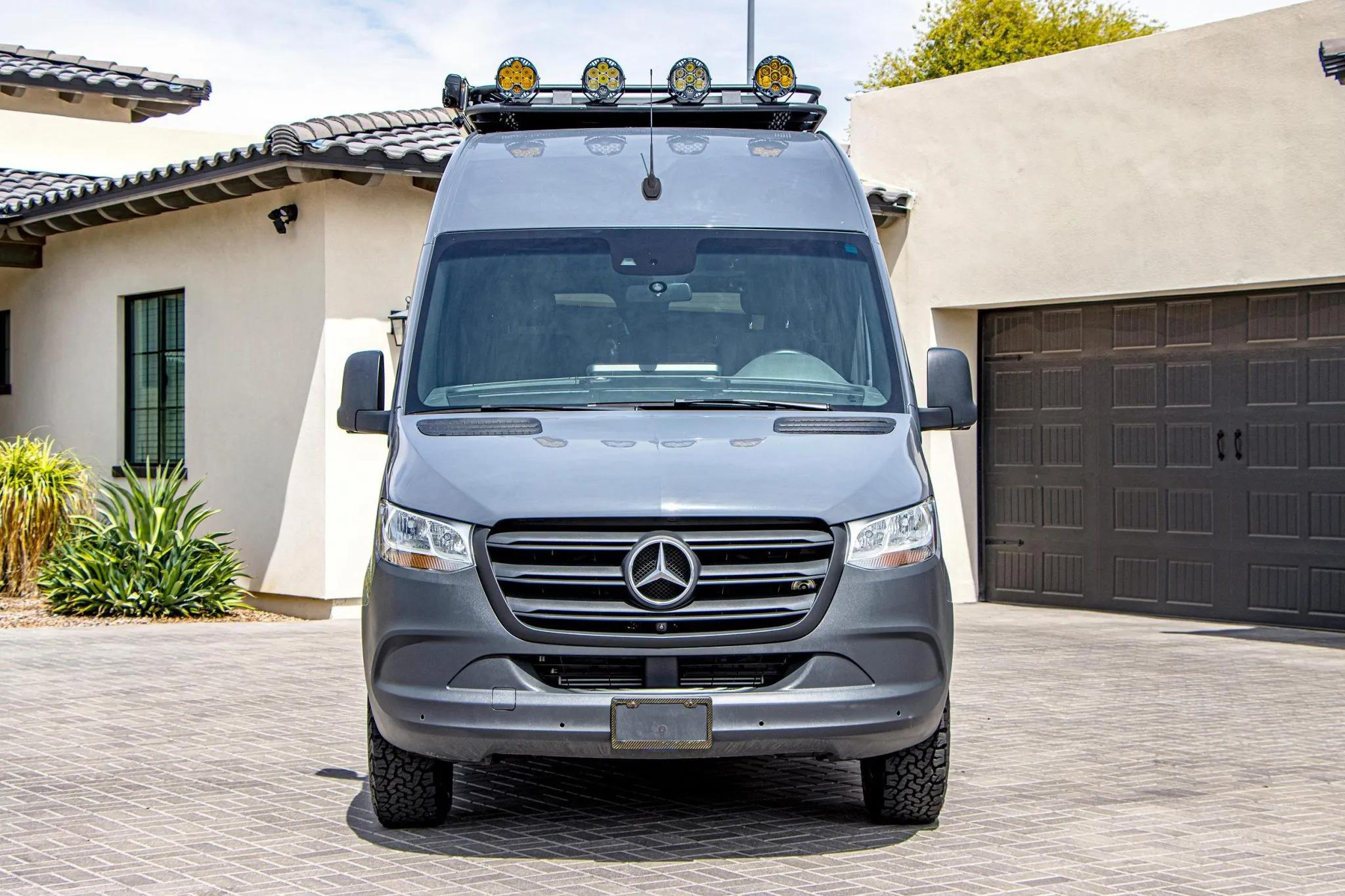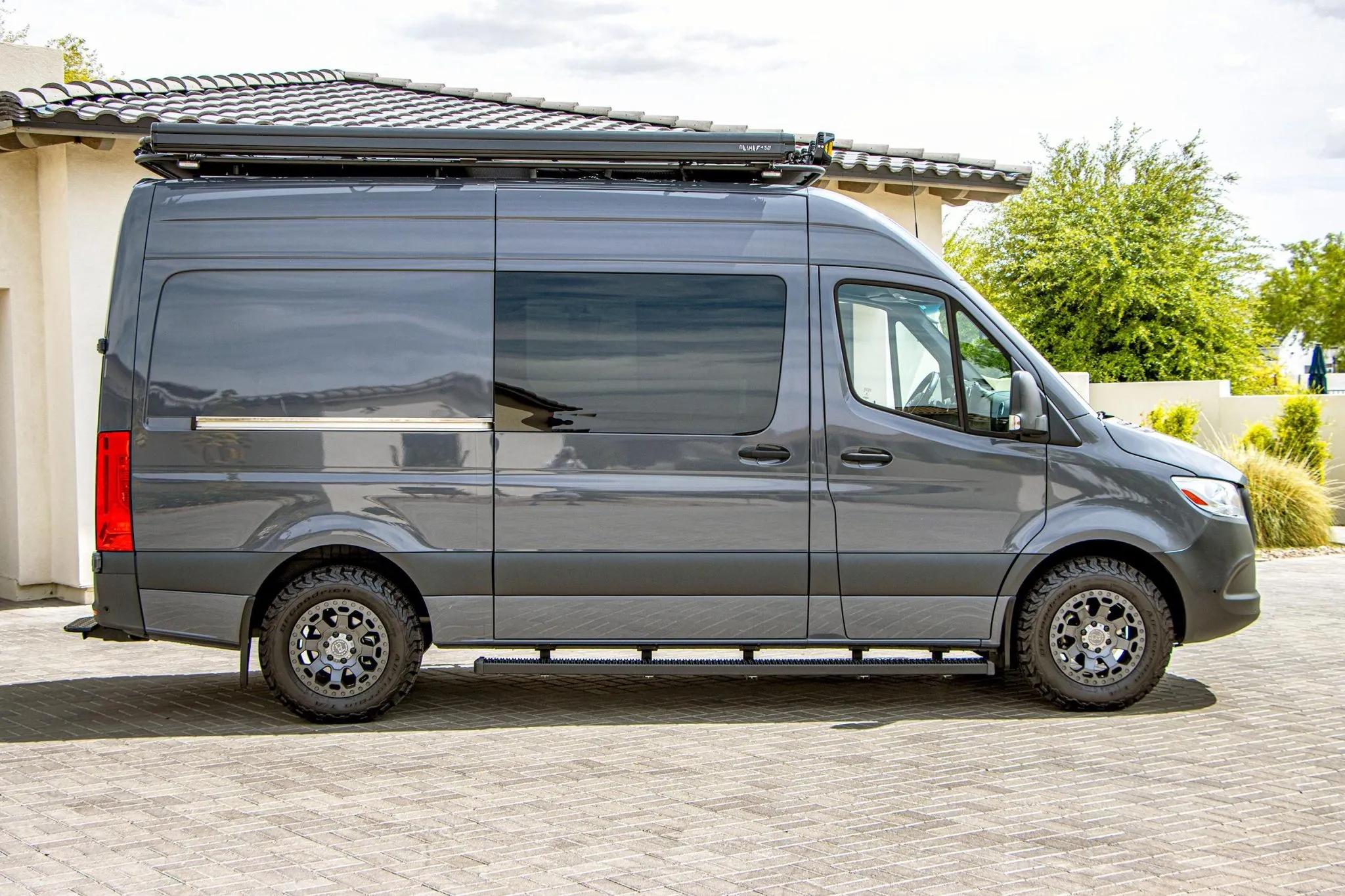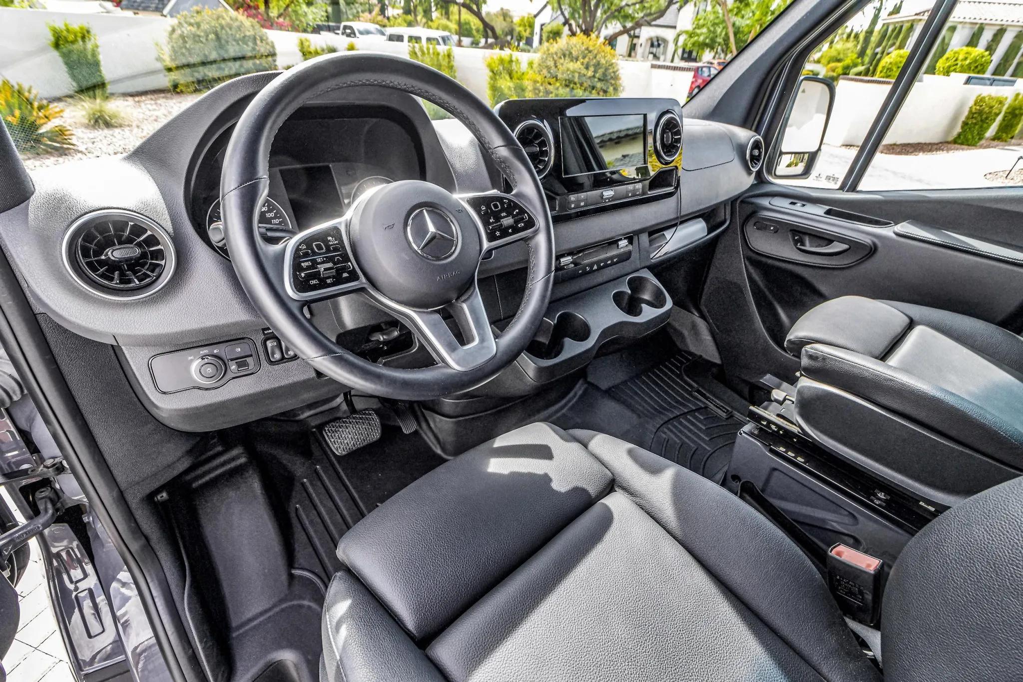 Finished in Pebble Grey over black leatherette, this high-roof Sprinter 2500 is powered by a 2.1-liter turbodiesel I4 producing 166 horsepower and 266 lb-ft of torque, paired with a seven-speed automatic transmission and rear-wheel drive.
