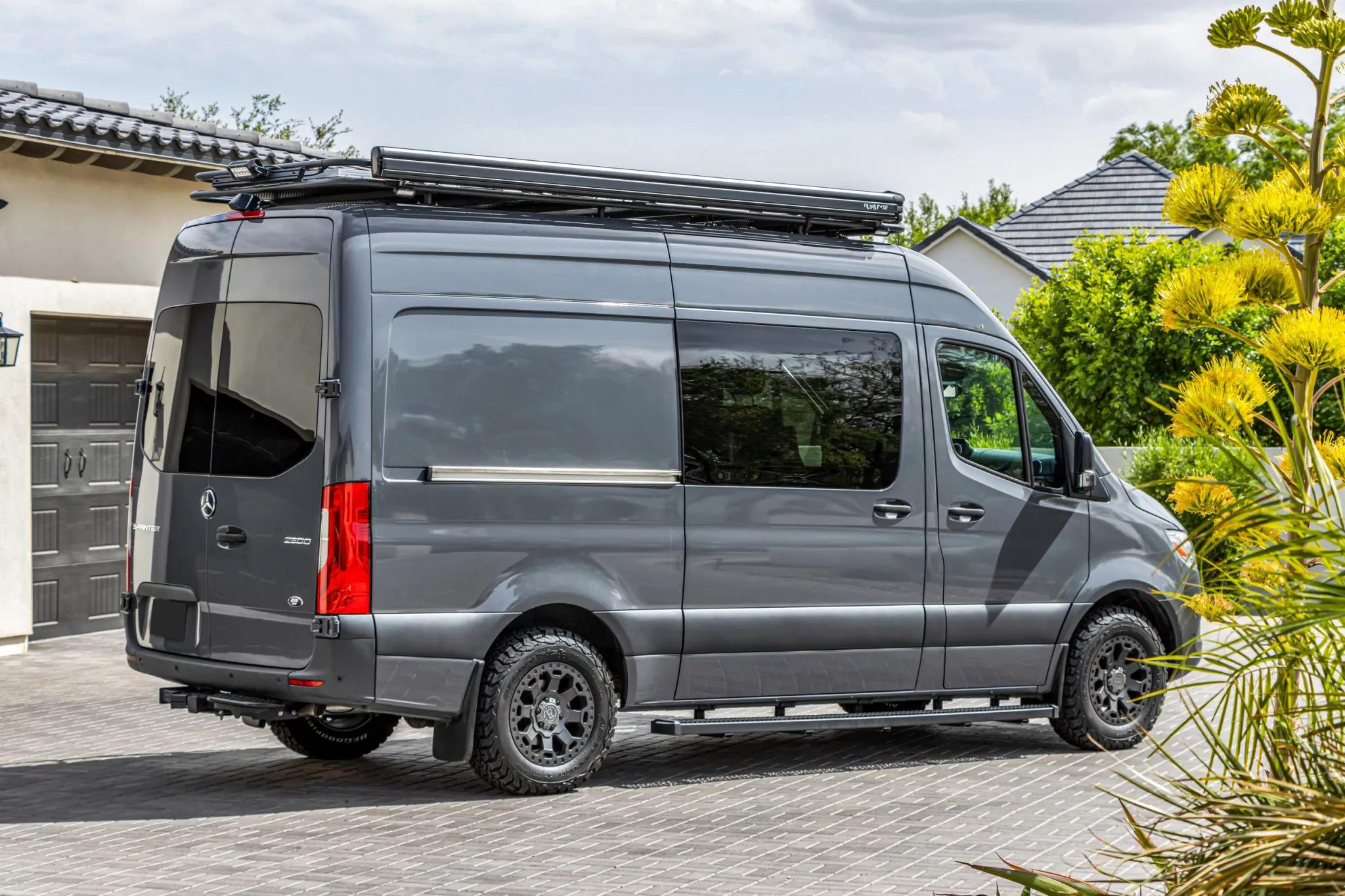 Exterior features include 17" Black Rhino wheels with 245/70 BFGoodrich All-Terrain T/A tires, side steps, a receiver hitch, roof rack, ladder, awning, solar roof panels, shore power connection, auxiliary lighting, LED off-road lights, tinted windows, and Parktronic sensors with a 360-degree camera system.