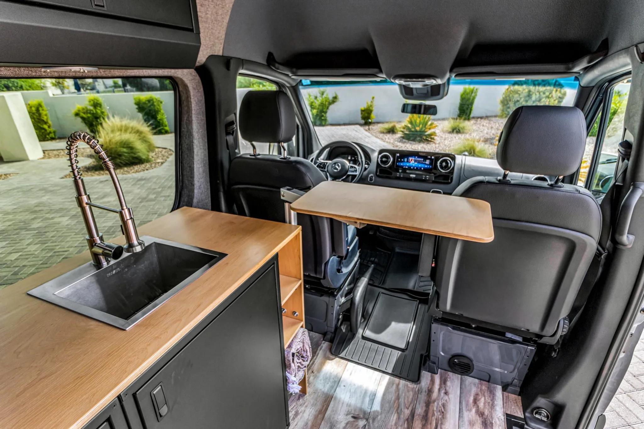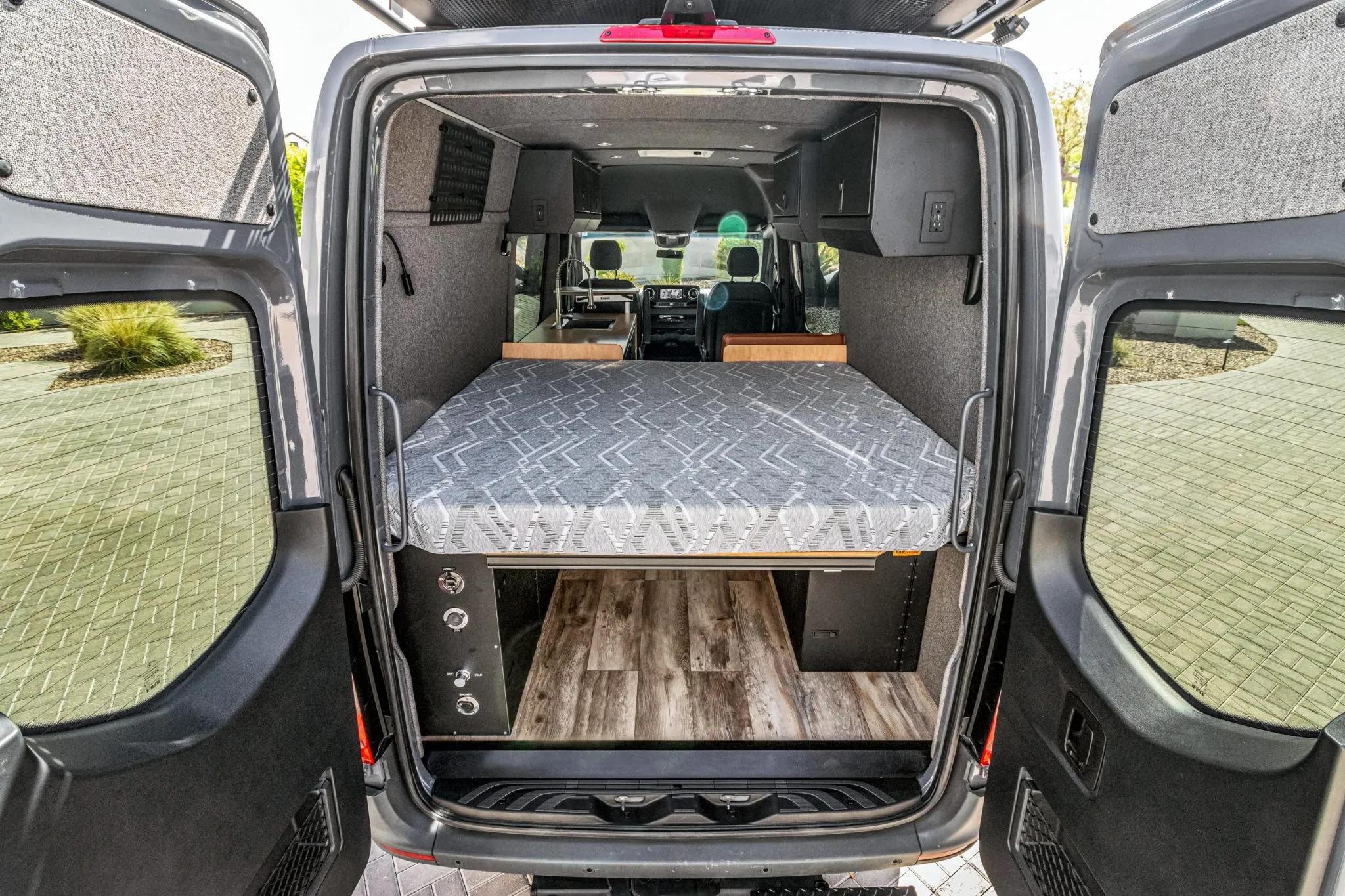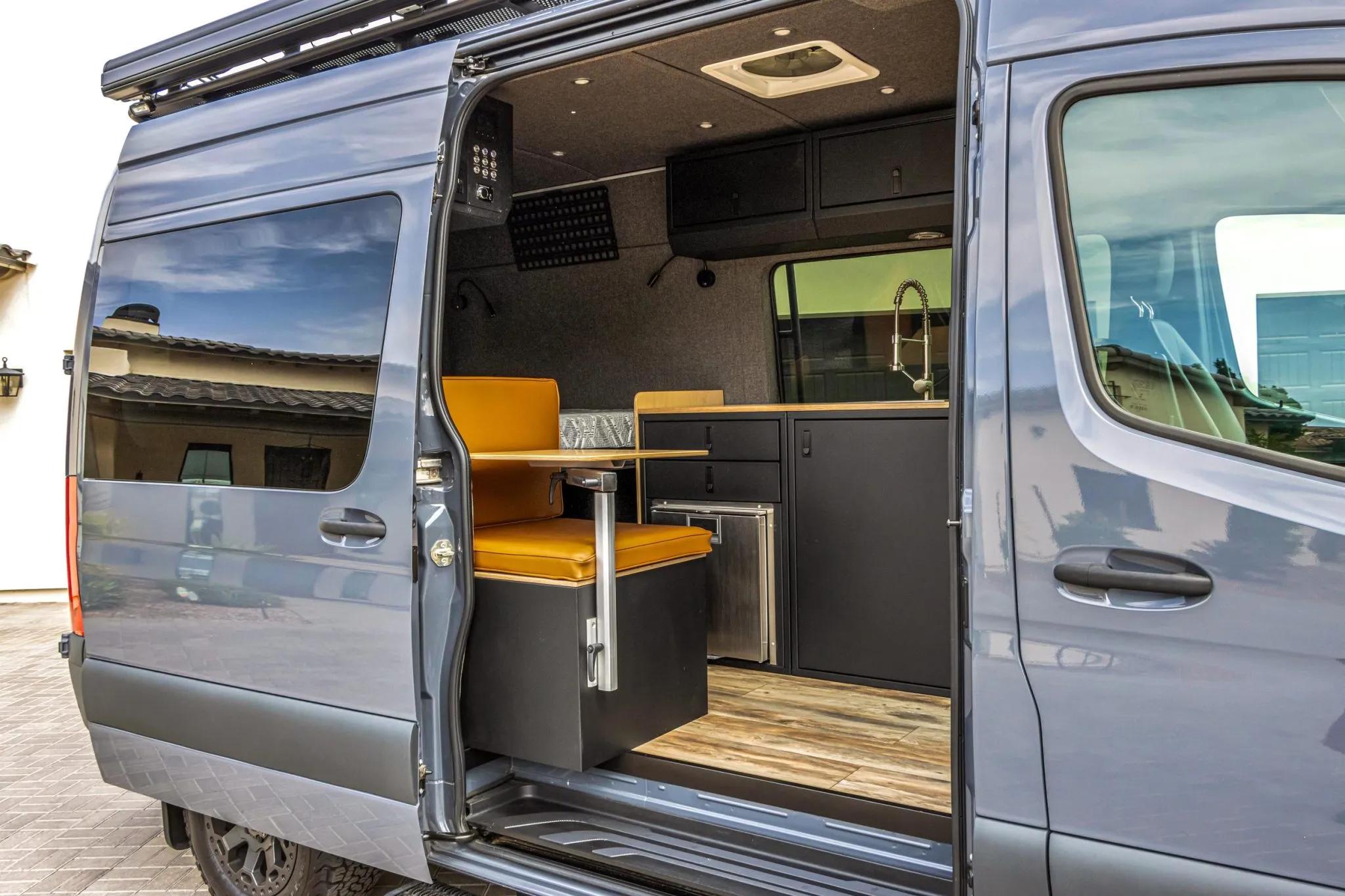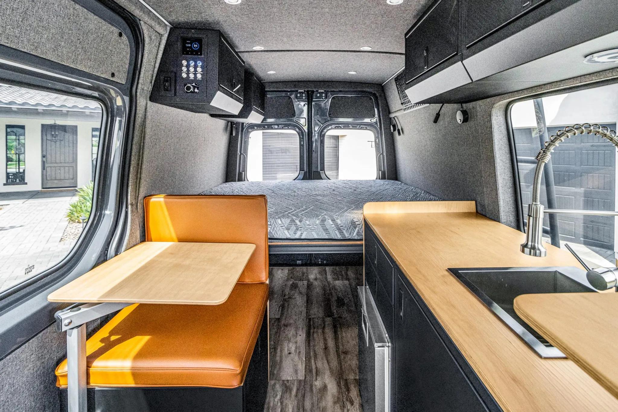The rear living area is outfitted with a bed, jump seat, swing-out tables, storage cabinets, refrigerator, portable induction cooktop, residential-style and USB outlets, overhead lighting, outdoor shower, water tanks, water heater, MaxxAir roof vent, diesel heater, power inverter, and a Simarine monitoring system.