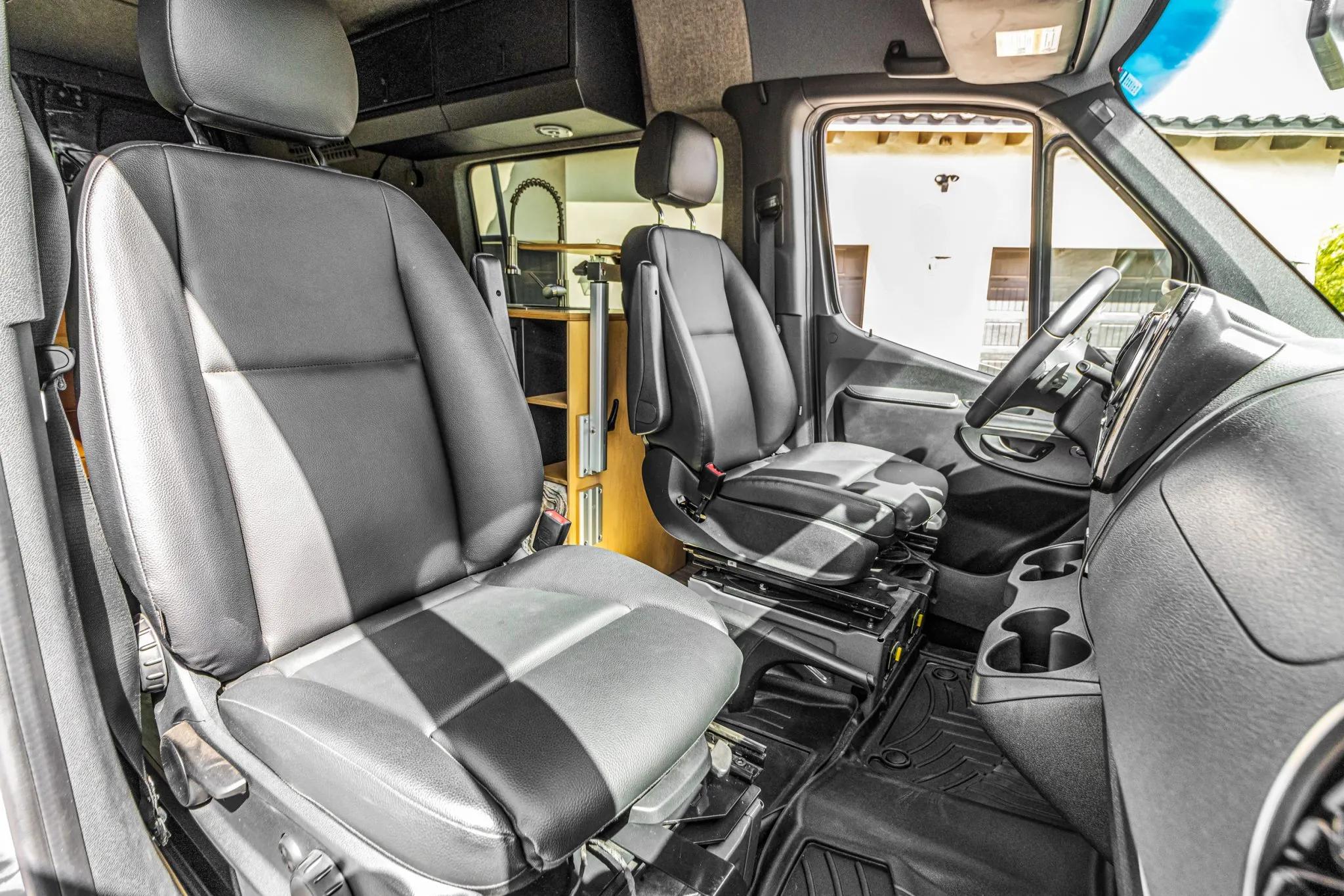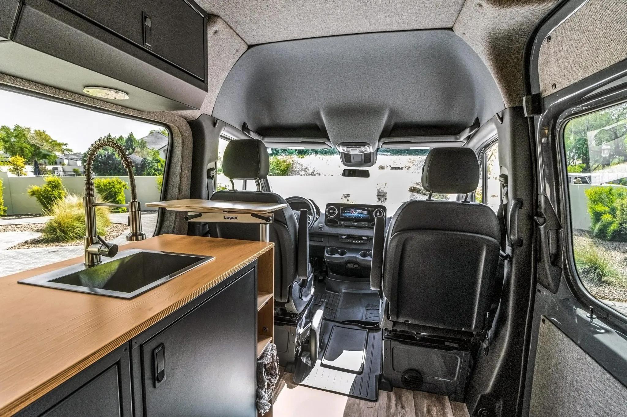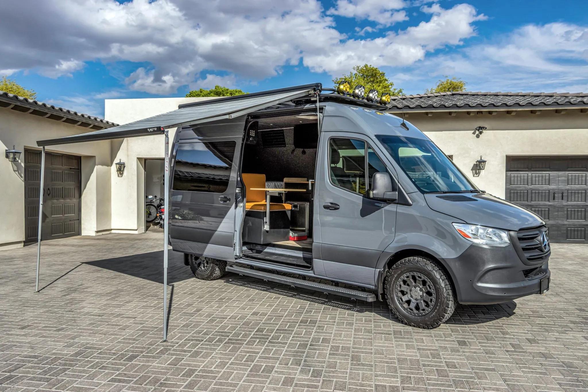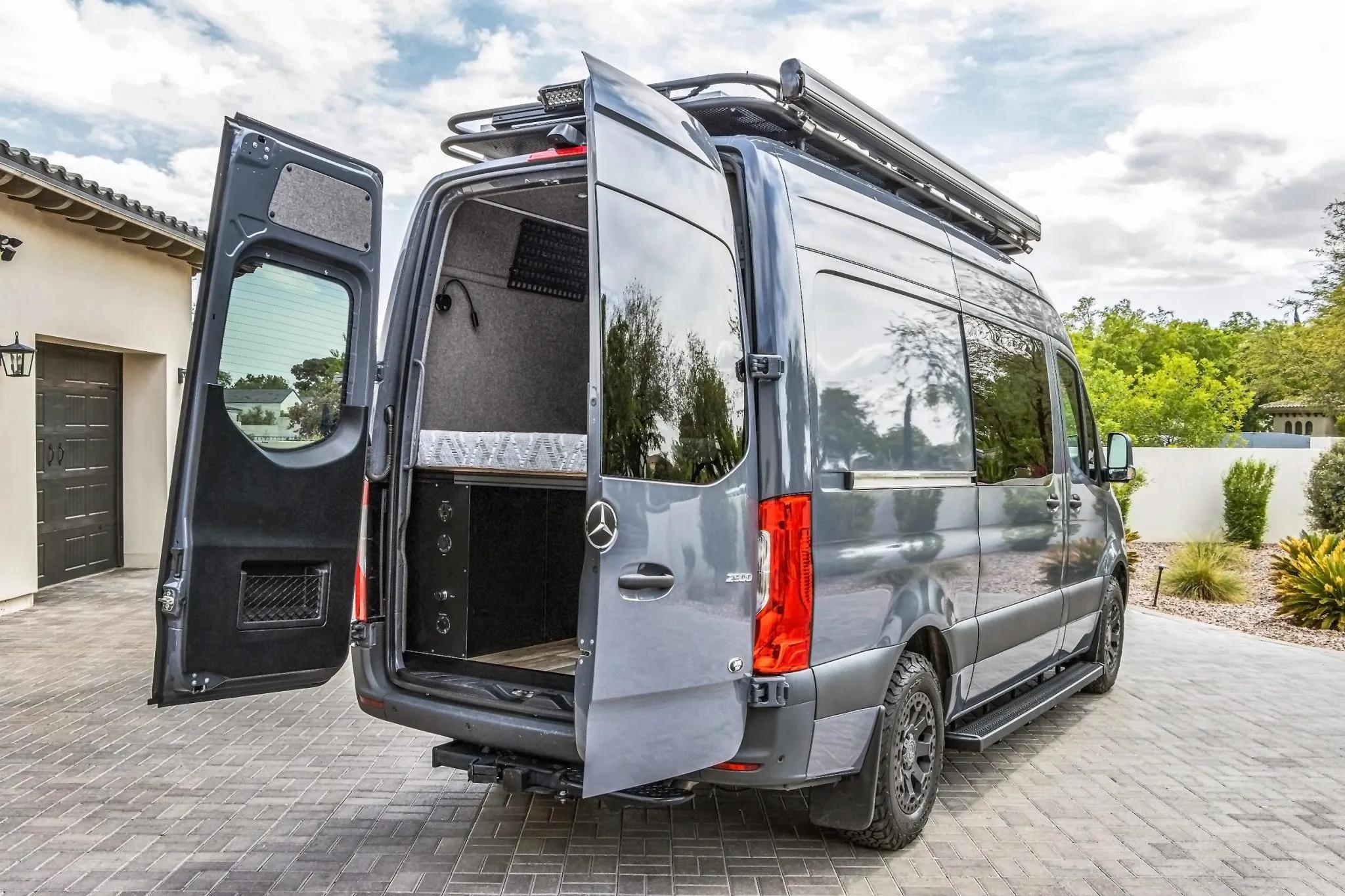 The rear living area is outfitted with a bed, jump seat, swing-out tables, storage cabinets, refrigerator, portable induction cooktop, residential-style and USB outlets, overhead lighting, outdoor shower, water tanks, water heater, MaxxAir roof vent, diesel heater, power inverter, and a Simarine monitoring system.
