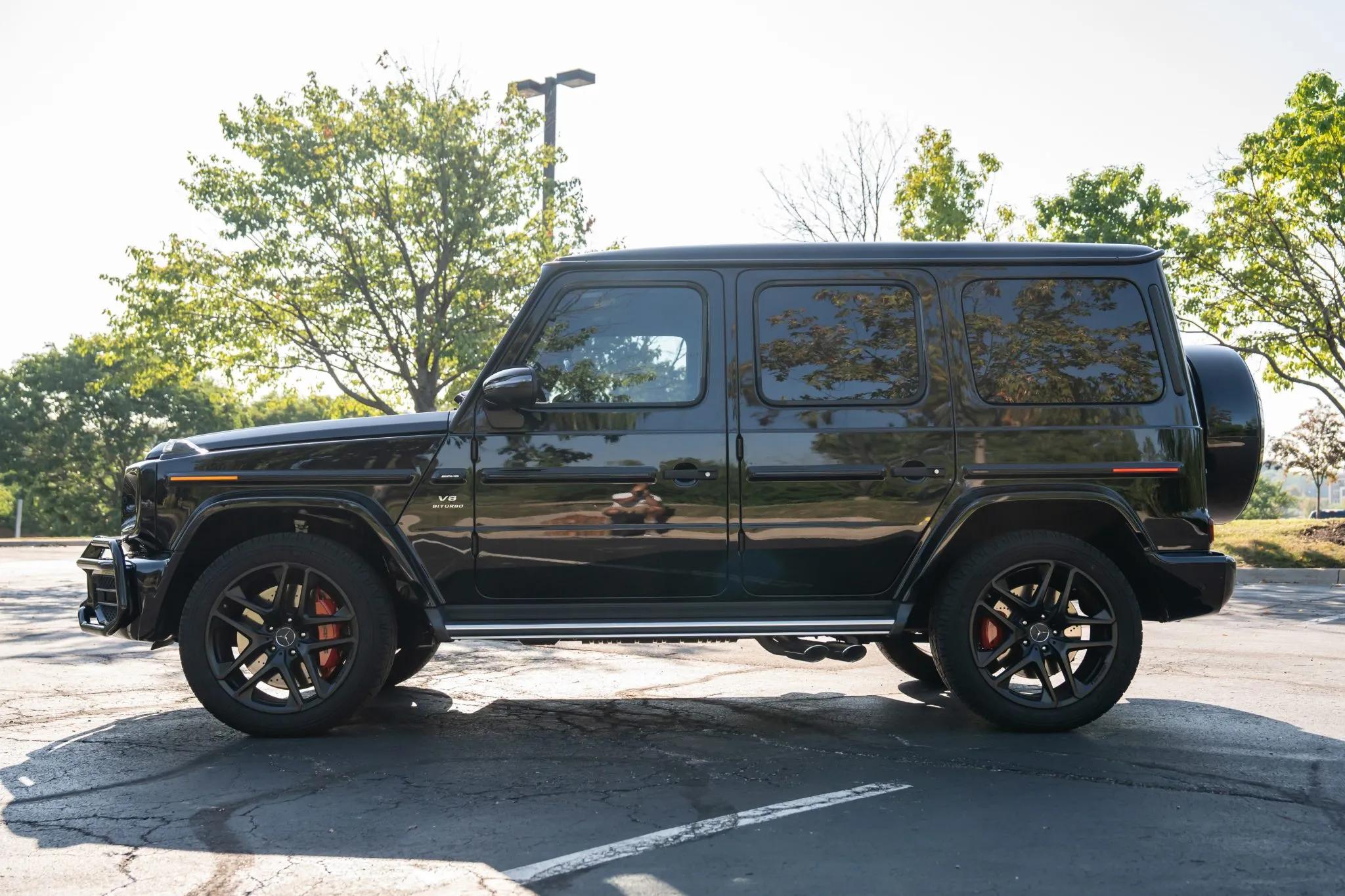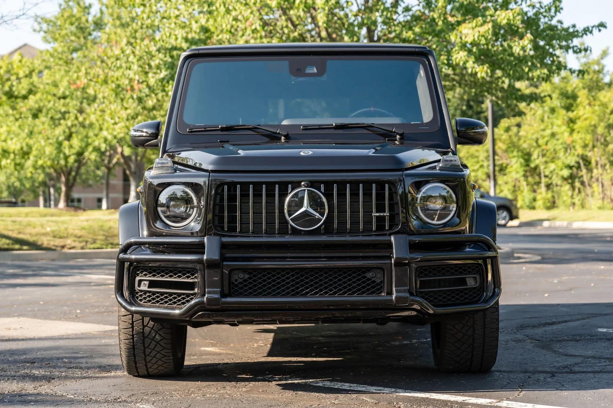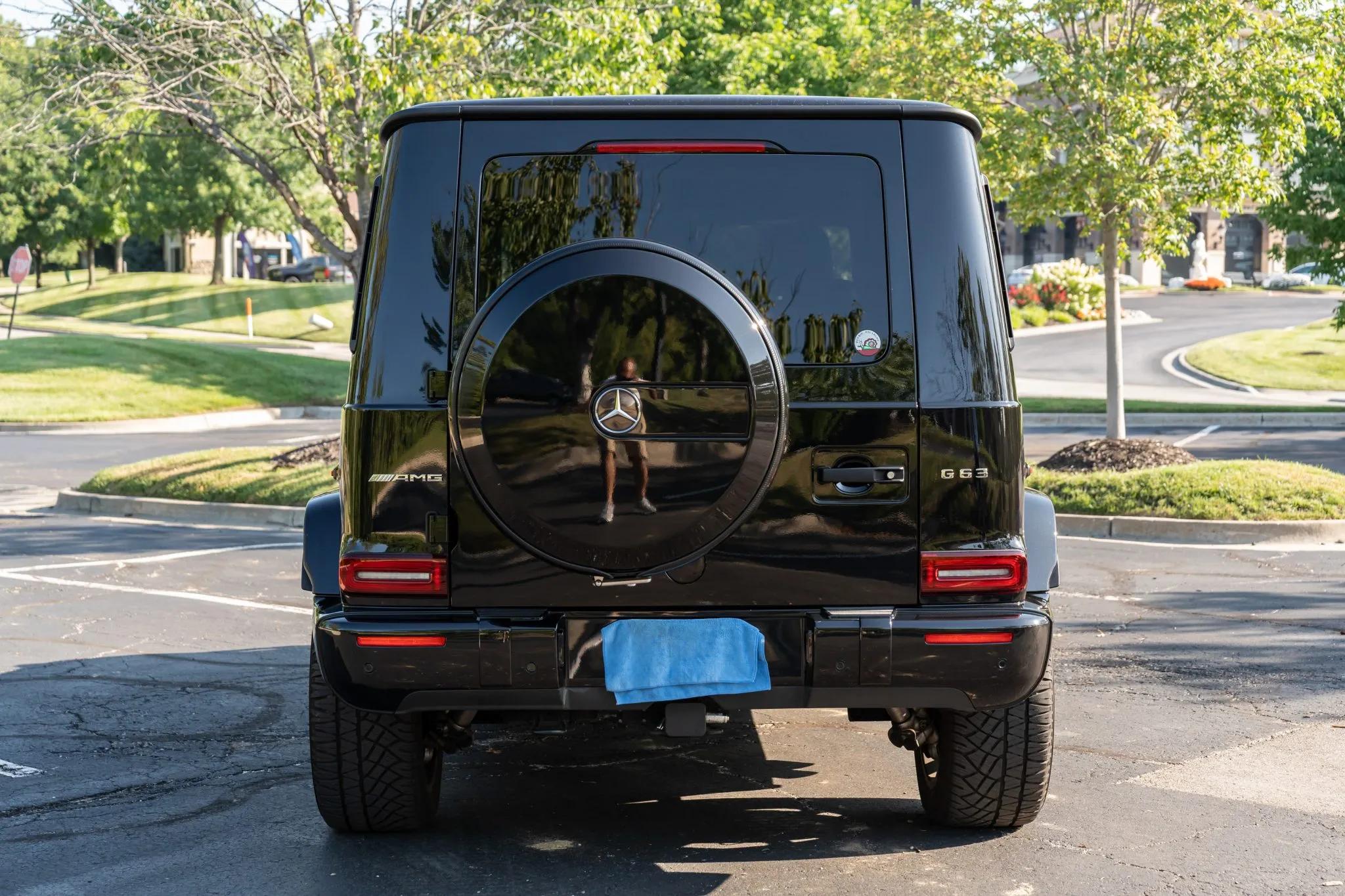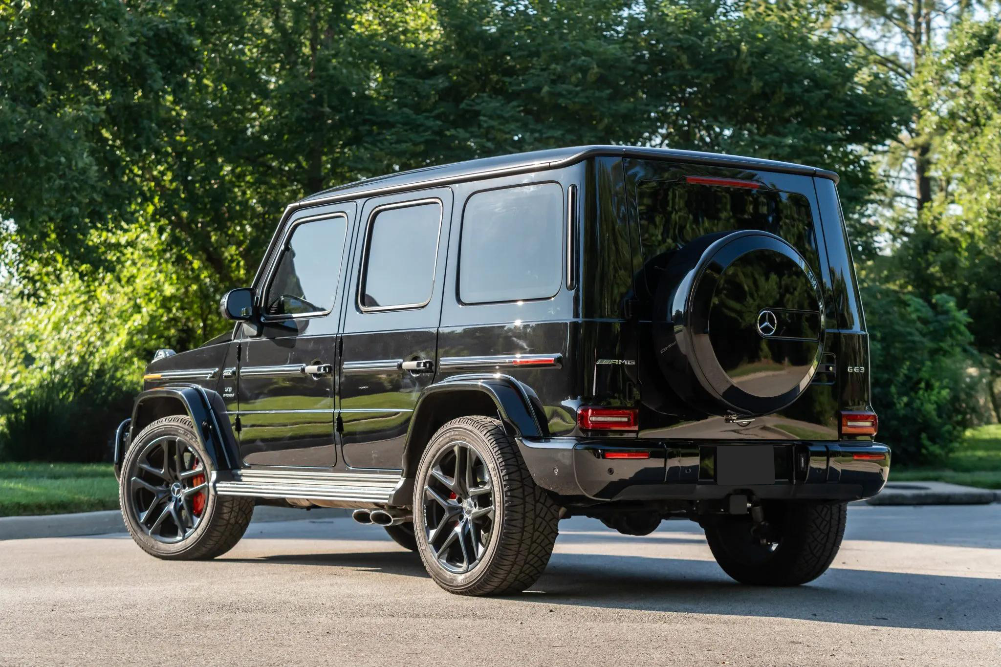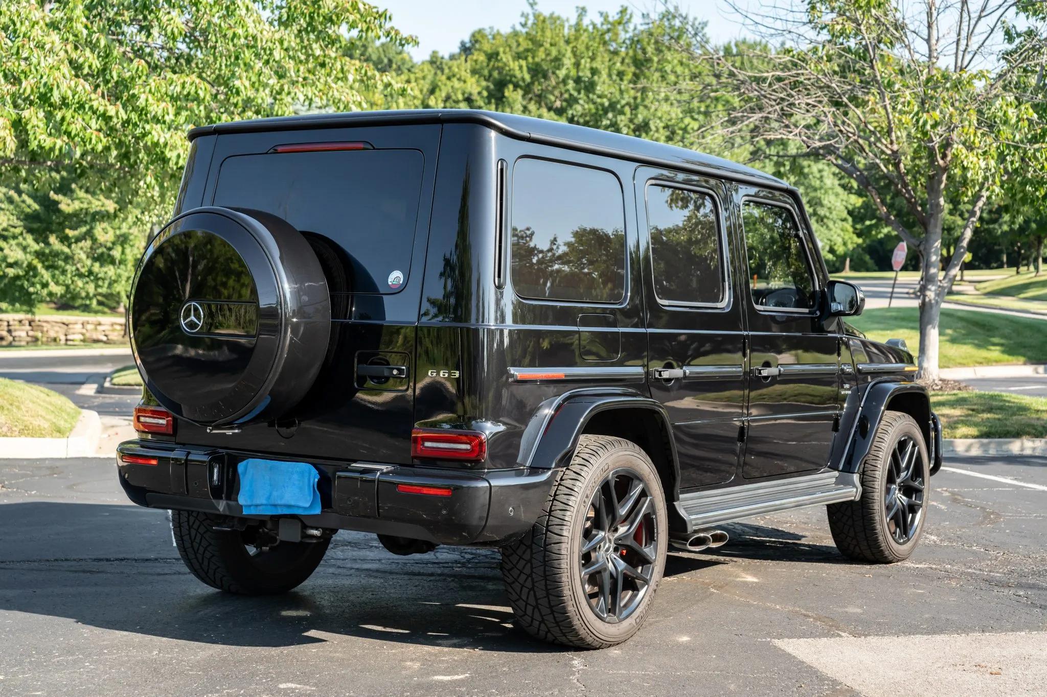 Finished in Obsidian Black Metallic over black Exclusive leather, this G63 is powered by a twin-turbocharged 4.0-liter V8 producing 577 horsepower and 627 lb-ft of torque, paired with a nine-speed automatic transmission and a dual-range transfer case.