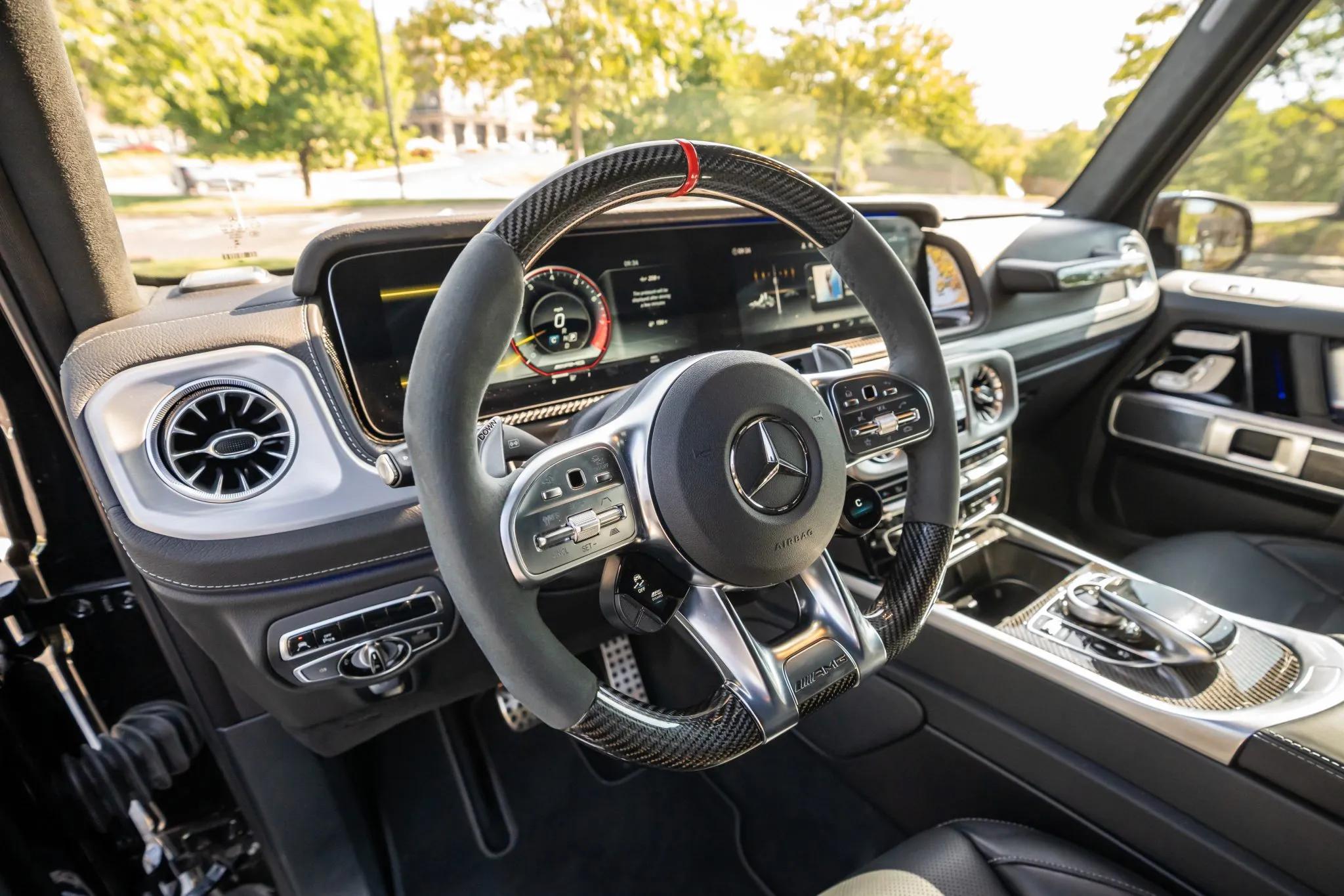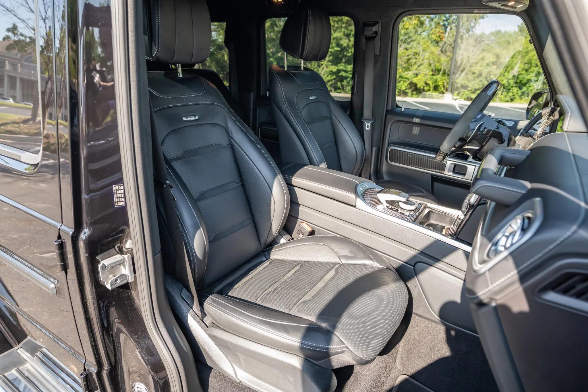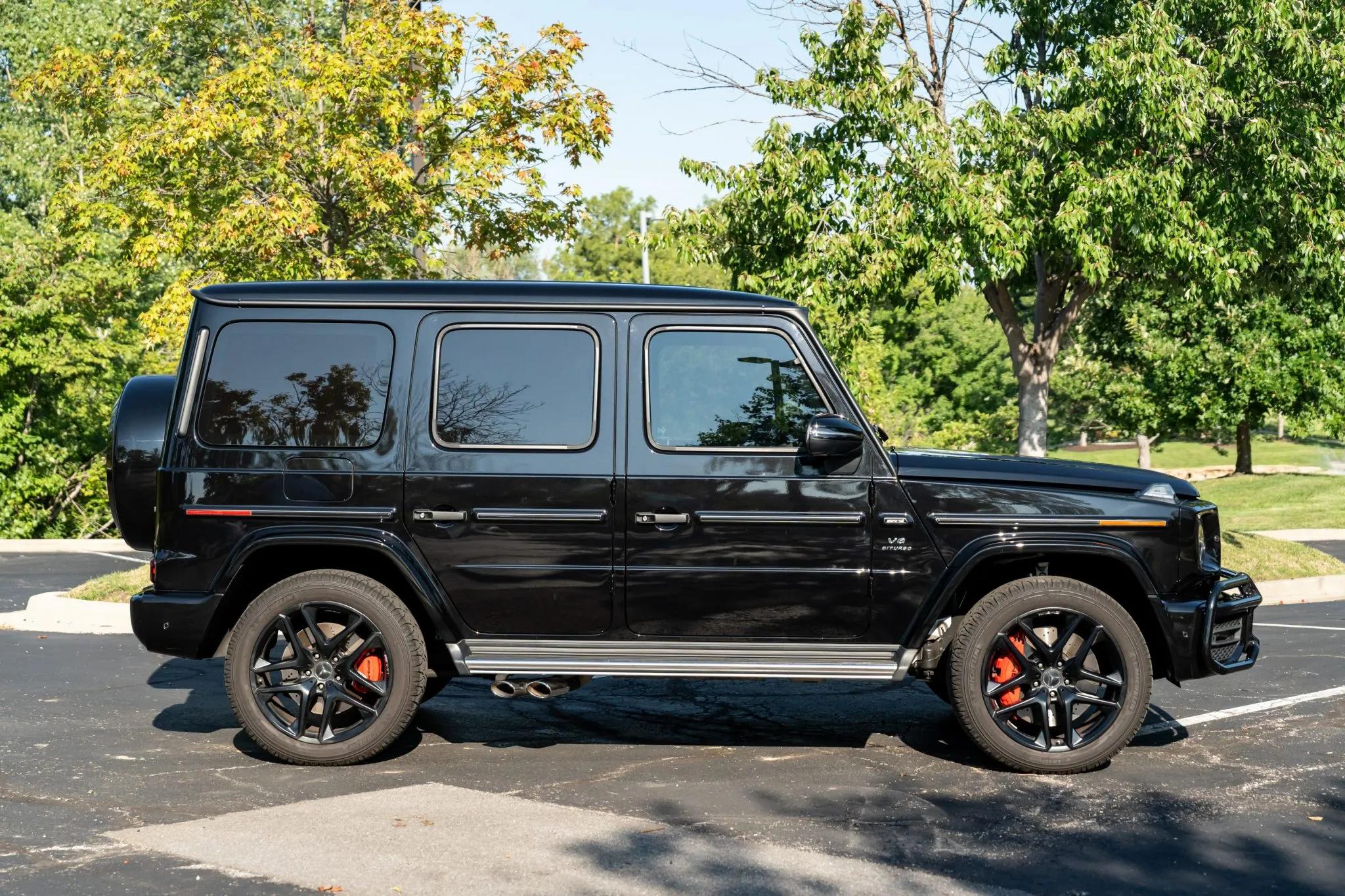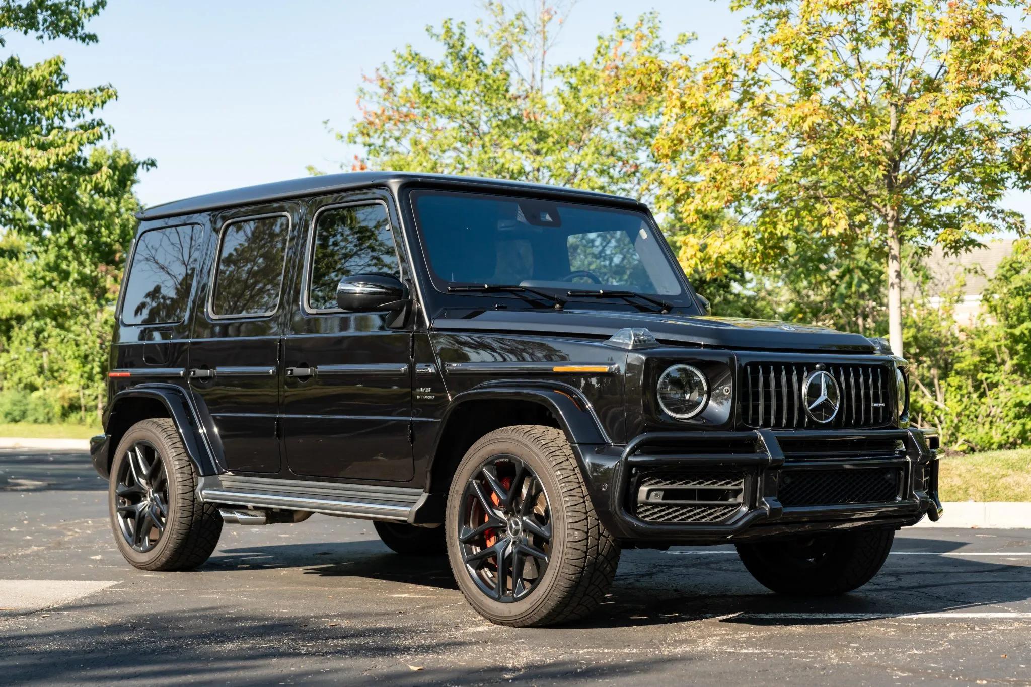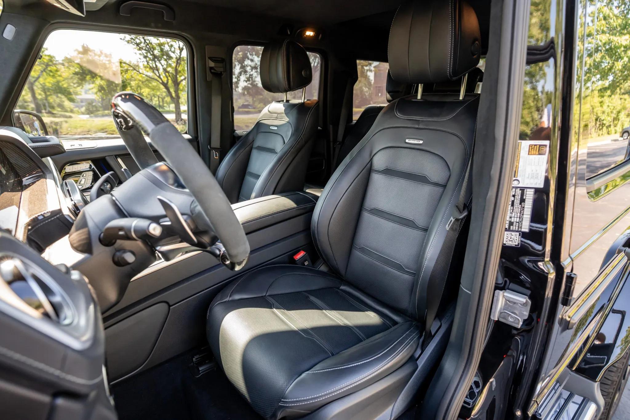 Finished in Obsidian Black Metallic over black Exclusive leather, this G63 is powered by a twin-turbocharged 4.0-liter V8 producing 577 horsepower and 627 lb-ft of torque, paired with a nine-speed automatic transmission and a dual-range transfer case.