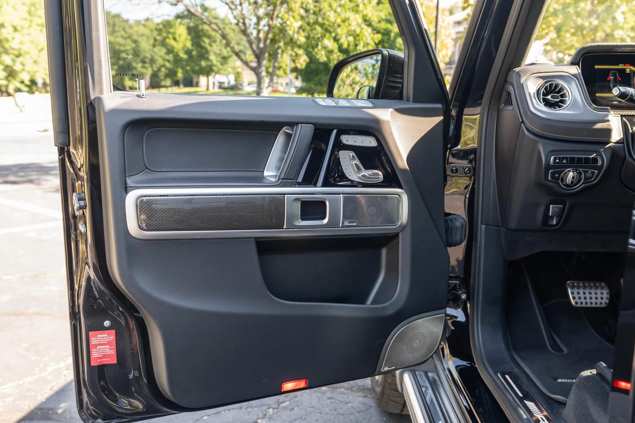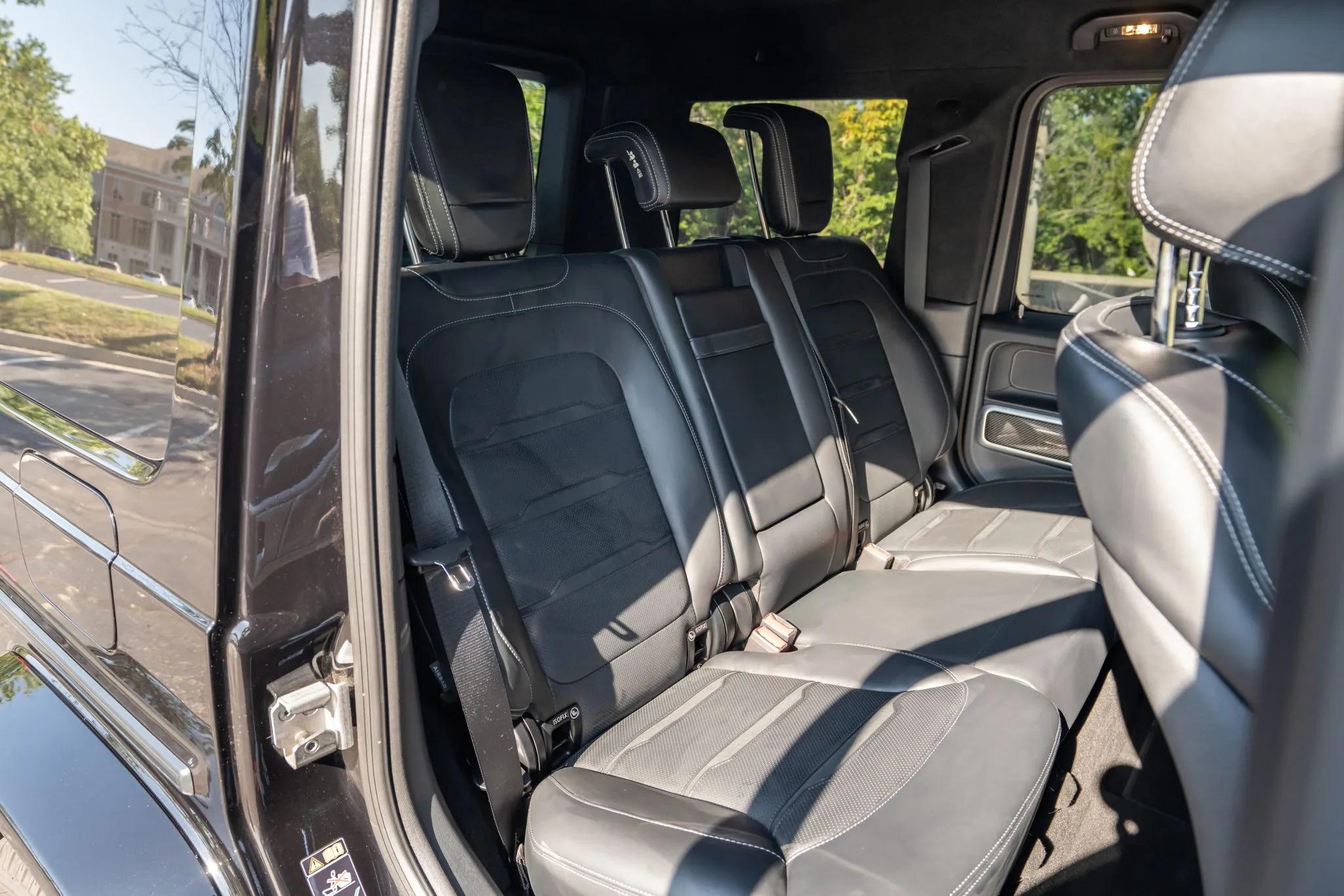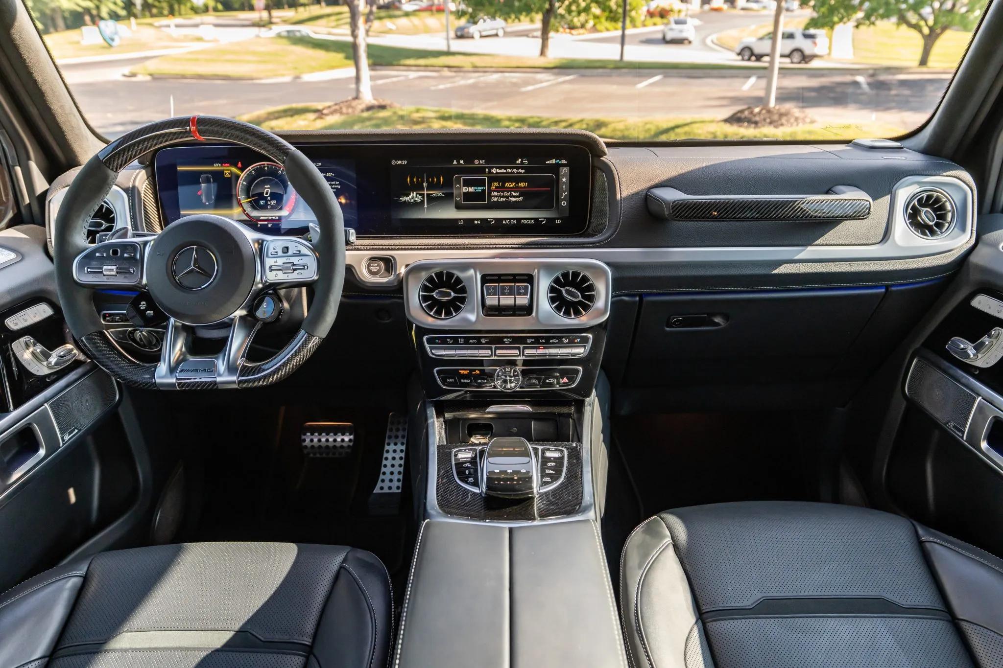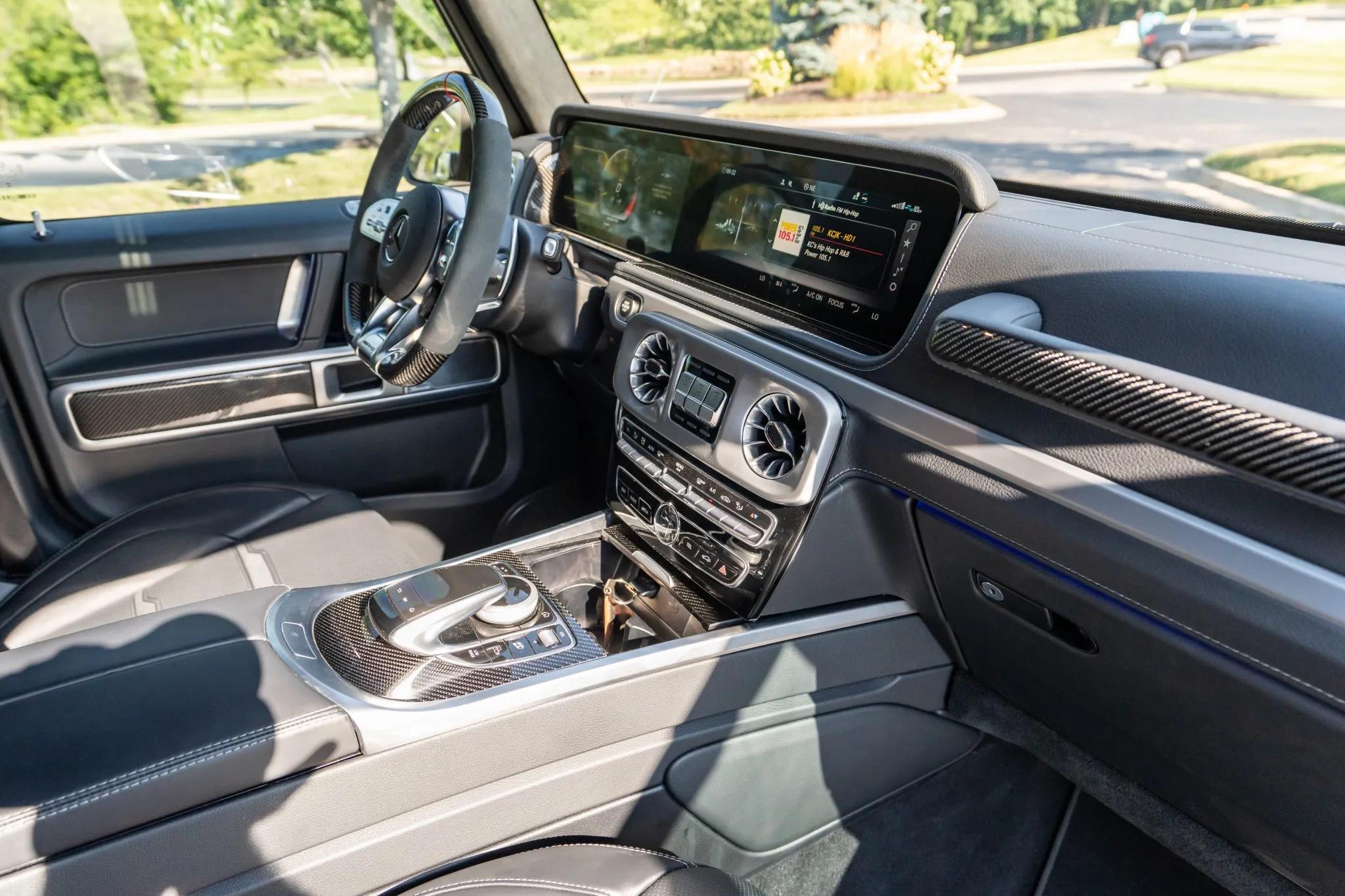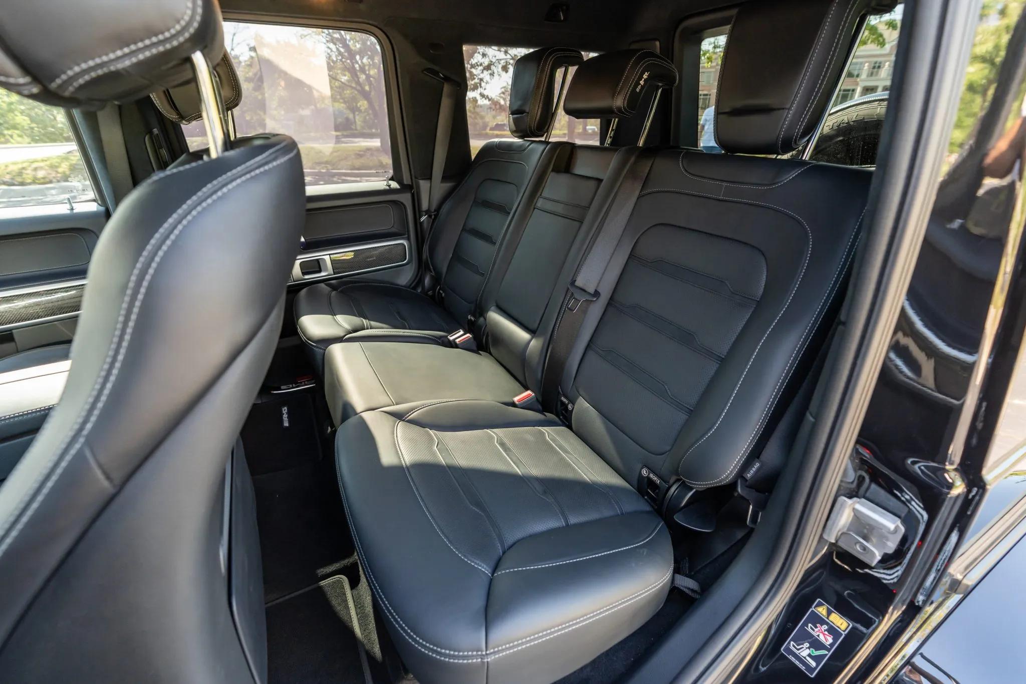 Finished in Obsidian Black Metallic over black Exclusive leather, this G63 is powered by a twin-turbocharged 4.0-liter V8 producing 577 horsepower and 627 lb-ft of torque, paired with a nine-speed automatic transmission and a dual-range transfer case.