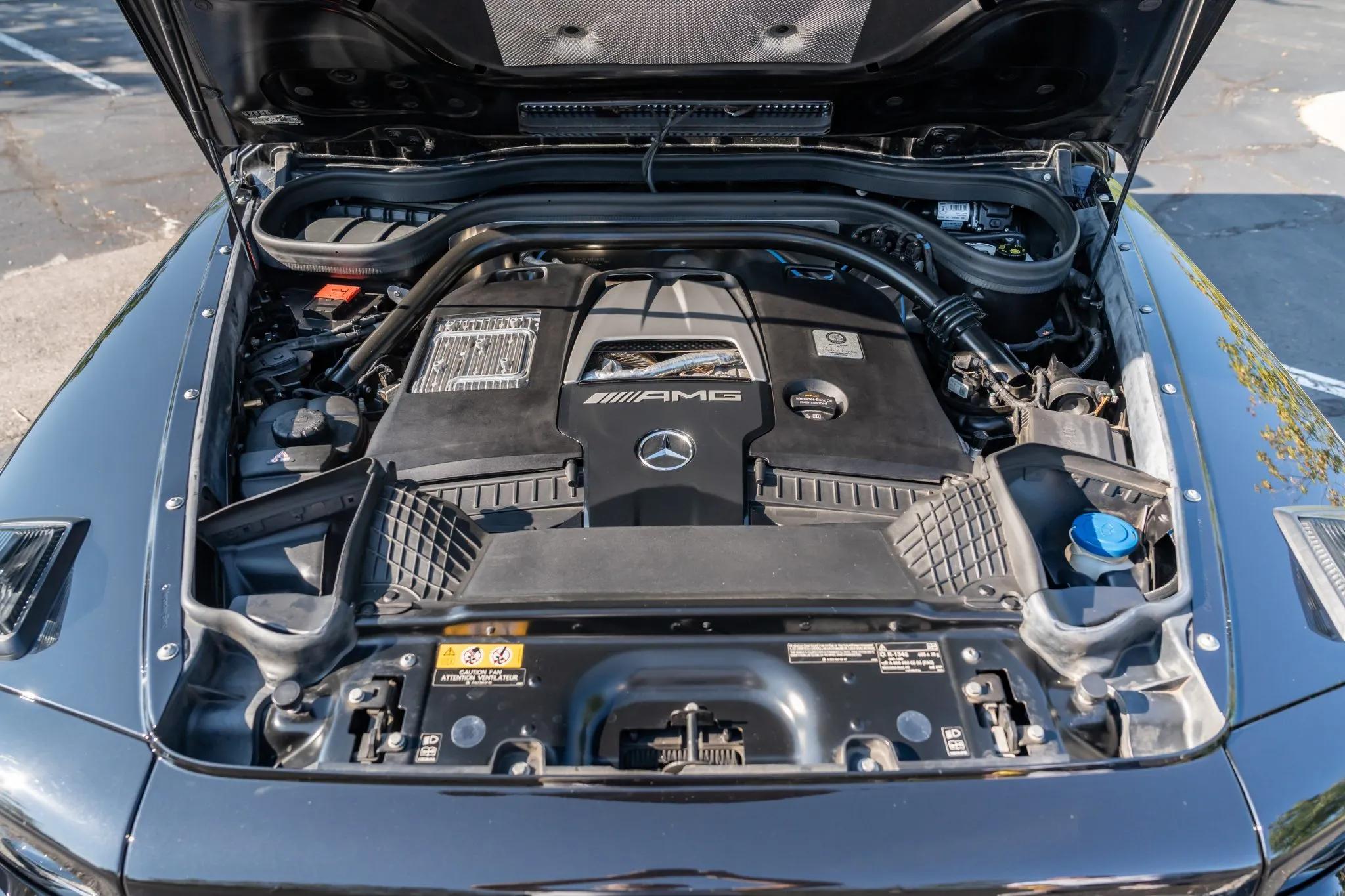 The cabin is upholstered in black Exclusive leather with carbon-fiber trim and Dinamica accents. Front seats are heated, ventilated, and massaging with memory settings, while the rear bench is heated. Interior amenities include Burmester surround sound, tri-zone automatic climate control, Apple CarPlay, Android Auto, ambient lighting, Blind Spot Assist, Distronic adaptive cruise control, illuminated door sills, and MBUX infotainment with navigation. The carbon-fiber AMG Performance steering wheel frames a 12.3" configurable digital instrument cluster.